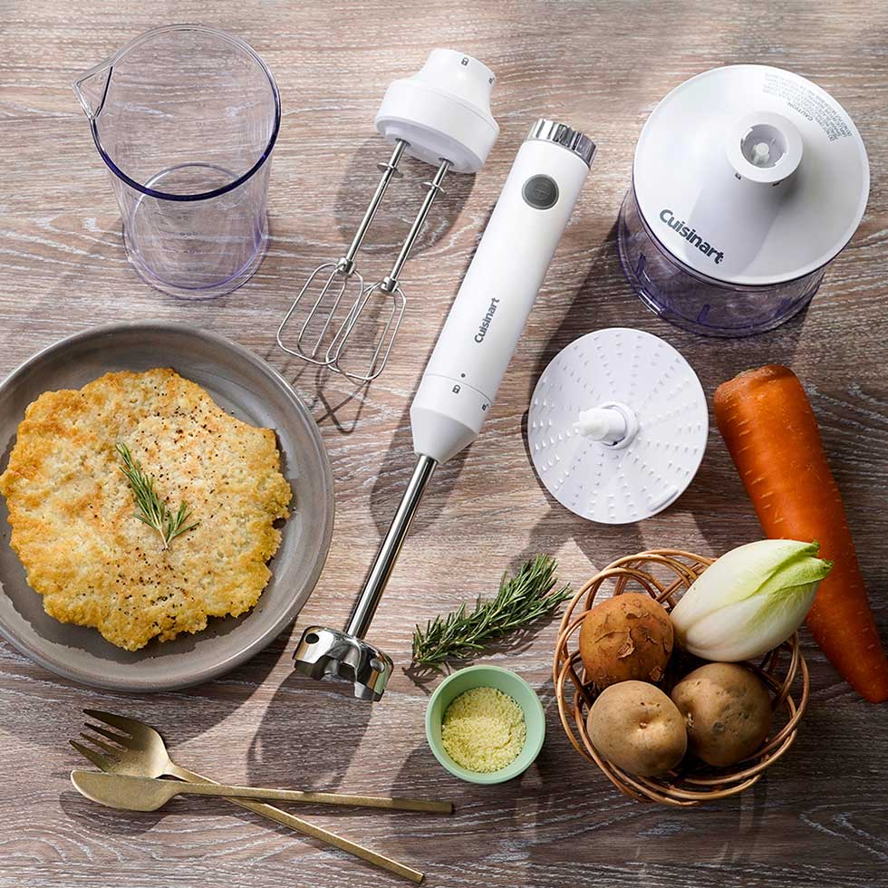 Cuisinart(クイジナート)スリム&ライトマルチハンドブレンダーおろしディスク付 / ホワイト スリムで軽く、圧倒的な使いやすさ。 圧倒的な軽さとパワフルさを両立したマルチハンドブレンダー。大根おろしも作れる、充実の1台6役。 「つぶす」「混ぜる」「泡立てる」「かき混ぜる」「刻む・ミンチ」「おろす」を時短でかんたんストレスフリーに。 料理のレパートリーが広がります。 Point.01 1台6役。 新シリーズから登場した「おろしディスク」は、細かめ・粗め両面仕様。いつもの大根おろしと共に、お好みで鬼おろしも簡単に作れます。大根おろしの他に、じゃがいものガレットや紅葉おろしなど、その他野菜のすりおろしも簡単に。 Point.02 離乳食作りも簡単に。 「つぶす」「混ぜる」機能のブレンダーを使用して10倍粥も簡単に。 専用カップと合わせて使用すれば、さらに少量のペーストもしっかり混ざります。 ハンドブレンダーやチョッパー、おろしディスクで、お子さまの成長に合わせた離乳食も、幅広く簡単に手作りできます。 Point.03 軽くて疲れ知らず。 ブレンダー使用時の重さは、わずか550g。調理中の重さが気にならなく、取り回しも良いので毎日手軽に、初心者でも安心して使えます。 Point.04 お手入れラクラク 接続部分を気にせずに丸洗いできるから、後片付けが簡単に。 Point.05 使い勝手へのこだわり機能 毎日でも使いたくなる取り回しの良さ。 Point.06 スタイリッシュなデザイン シルバーのスピード調節ダイヤルを基調にホワイトとブラックのスタイリッシュなデザイン。キッチンに置いておくとインテリアのポイントとなる一台。プレゼントにもオススメです。 Point.07 安心のメーカー保証 商品内容 アタッチメント違いはこちら アタッチメント2種類 詳しくはこちら ≫ アタッチメント4種類 詳しくはこちら ≫ 商品仕様 製品名 スリム&ライト マルチハンドブレンダー おろしディスク付 セット内容 本体、ブレンダー、チョッパー、おろしディスク、ビーター、専用カップ 電源 AC100V 50/60Hz 消費電力 200W 定格時間 ブレンダー 1分、ビーター 3分、チョッパー 1分、おろしディスク 2分 回転数(約) ブレンダー 16,000回/分、ビーター 1,550回/分、チョッパー 3,750回/分、おろしディスク 3,750回/分 外形寸法(約) ブレンダー 幅 60mm x 奥行60mm x 高さ360mm ビーター 幅 73mm x 奥行60mm x 高さ380mmチョッパー 幅 130mm x 奥行130mm x 高さ320mmおろしディスク 幅 130mm x 奥行130mm x 高さ320mm 質量(約) ブレンダー 550g、ビーター 610g、チョッパー 795g、おろしディスク 820g コードの長さ(約) 1.5m(有効長) 機種変更日・理由 2023年7月14日・後継機種へのマイナーチェンジ