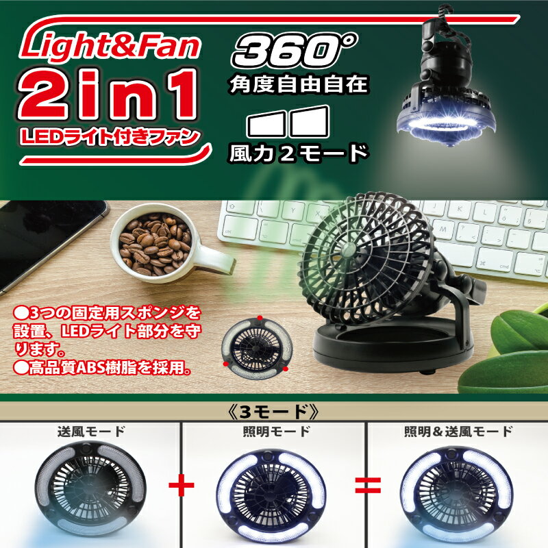 乾電池式でどこでも使えるLEDライト付きファンです。 フック付きなので、作業場やテントの中に吊るせます。 風量は2段階の調節が可能! 使い方は送風・照明・送風+照明の3パターンから選べます。 360度の自由に角度調整ができるのも魅力的! 車の整備や、DIY、アウトドアやレジャーなど幅広くお使いいただけます。 もちろん防災グッズとしても! 本体サイズ:約直径167×高さ184mm 本体重量:約410g(電池除く) パッケージ込サイズ:約幅170×高さ190×奥行170mm パッケージ込重量:約515g ■生産地:中国 ■素材・成分:ABS 使用電池:単1乾電池×2本(別売) ルーメン:50LM 使用時間 ●扇風機:使用最大約12時間 ●LEDライト:使用最大約45時間 ●扇風機+LEDライト:使用最大約10時間 保証期間:3か月 【ご使用上の注意】 ●本製品の修理・改造・分解は絶対にしないでください。 ●本体に強い力をかけないでください。 ●乱暴に扱ったり落下などの衝撃を本体に加えないでください。破損、故障の原因となります。 ●お子様の手の届かない場所へ保管・使用しないでください。 ●火気・高温多湿の場所での使用・保管はおやめください。 ●製品の本来の使用目的以外でのご使用はおやめください。 ●廃棄の際は各地方自治体の廃棄区分に従って処理してください。 ●使用後は乾電池を抜いてください。