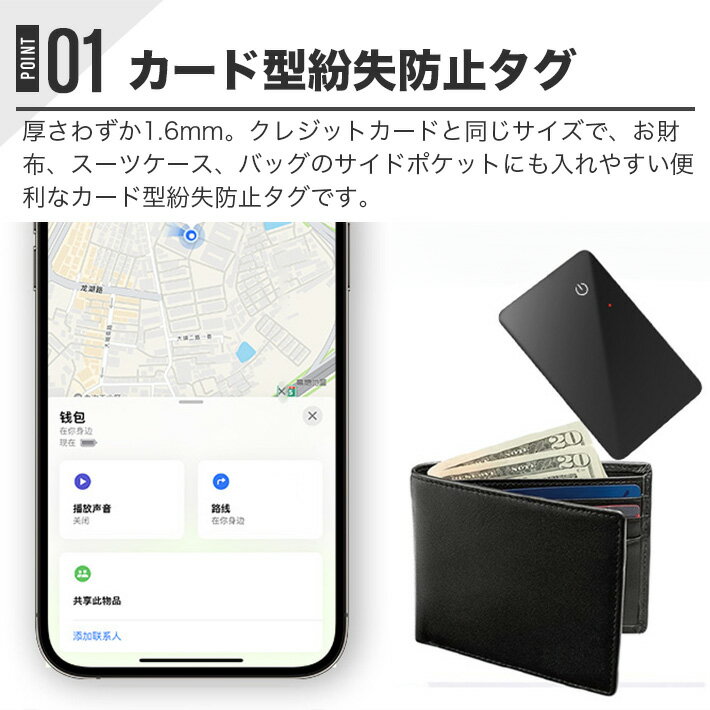 【さらに進化!“薄さ”を徹底的に追求した最新モデル】従来品や市販品と比較した進化ポイントはこちら>>(1) さらに薄く、さらに軽く!業界最薄の1.6mmスマートタグ(2) 使い捨てではなく、ワイヤレス充電に対応(3) 便利なストラップホール付き(4) 指紋がつきにくく、耐摩耗性に優れたマット仕上げ(5) 防水性能がさらに向上(6) 押して実感できる押下式電源ボタンを採用【驚きの1.6mm!「2025年超薄型」紛失防止タグ カード型】超コンパクト!厚さわずか1.6mm。クレジットカードと同じサイズで、お財布、スーツケース、バッグのサイドポケットにも入れやすい便利なカード型紛失防止タグです。市販品には2mm以上の厚みがある製品が多い中、本製品は「厚さ1.6mm」で、財布やカードケースにもすっきり収納できます。【ワイヤレス充電対応:お客様の声から誕生した新機能】1時間の充電で最長6か月使用可能。ワイヤレス充電器に置くだけで充電が始まり、電池交換の手間が不要です。※ご注意:ワイヤレス充電器は付属していません。市販のDC5V 0.5A以上に対応したワイヤレス充電器をご使用ください。※バッテリーの消耗は、使用環境や音の再生頻度などにより異なります。【探し物が簡単に見つかる!】地図で一目で位置を確認!探し物の場所を地図上で特定し、そこまでのルート・距離・所要時間もすぐに表示されます。海外でも位置特定が可能です。落とし物や貴重品の追跡、紛失防止、盗難対策に最適です。従来の小型GPSタグとは異なり、省電力設計でバッテリーが長持ちします。【音で知らせて発見】近くにある場合、「探す」アプリの「サウンドを再生」ボタンを押せば音が鳴り、場所がすぐにわかります。また「Hey Siri、お財布を探して」と話しかけるだけで操作可能。探し物が見つからずに焦るストレスから解放されます。従来の探し物発見器や落とし物発見器よりもスマートで使いやすい設計です。【忘れ物防止タグ】持ち物が手元から離れると、スマートフォンにプッシュ通知が届きます。置き忘れた際はすぐに気づいて取りに戻ることができます。自宅や職場など、通知が不要な場所の除外設定も可能です。また、万が一カードを紛失しても「紛失モード」をオンにすればロックがかかり、拾った人が「探す」アプリでスキャンすると、持ち主が登録した電話番号またはメールアドレスが表示されます。【安心のMFi認証品】Apple社の定める性能基準を満たしており、iOSデバイスとの高い互換性を持ちます。Appleの「探す」ネットワークに対応しているため、安定した接続が可能で、日本はもちろん世界中で利用できます。技適認証も取得済みです。本製品はiOS専用に開発されたスマートトラッカーのため、iOSデバイスとの接続も3ステップで完了。専用アプリのダウンロードも不要です。※iOS 14.5またはiPadOS 14.5以降に対応。Androidには非対応です。【プライバシーも安心】位置情報などは、紐付けられたApple IDでしか確認できません。ユーザーがペアリングを解除しない限り、タグがリセットされても他のApple IDとは接続できません。Appleの「探す」ネットワークと連携し、Appleのプライバシーポリシーに基づいてデータはすべて暗号化されており、個人情報は特定されません。安心してご利用いただけます。【防水性・耐久性】「IP68」等級の高い防塵・防水性能により、雨の影響を受けやすい屋外でも安心して使用できます。【パッケージ内容】・本体・日本語取扱説明書