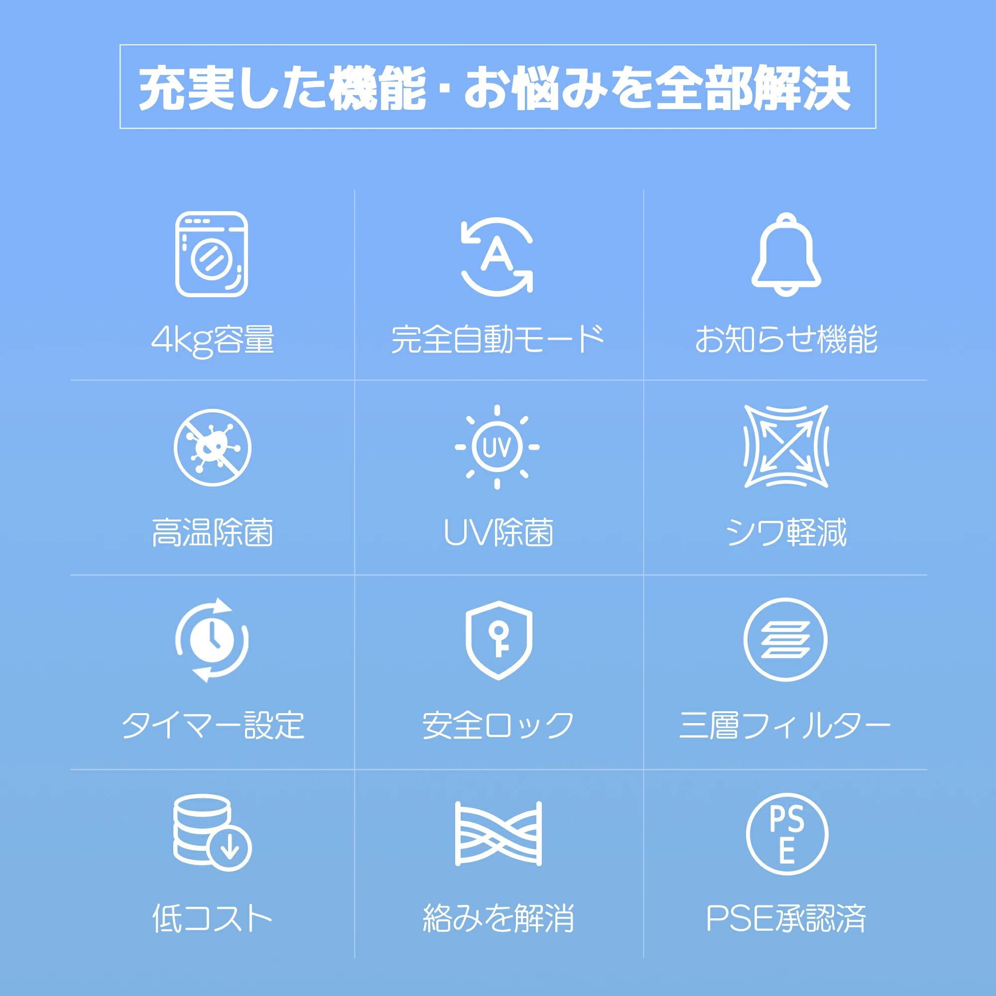 商品仕様 検索キーワード:【UV 高温除菌】SENTERN 衣類乾燥機 4kg 家庭用 小容量 小型 乾燥機 自動乾燥 温度調節 除湿 高温除菌 シワ取り 布団乾燥 アイロン 静音 チャイルドロック ドラム式 湿気対策 梅雨対策 カビ対策 花粉対策 PSE認証済み 商品名 衣類乾燥機 4kg 標準乾燥容量 4KG 商品サイズ 商品外寸:約幅41x奥行49x高さ61cm ?包サイズ ?包サイズ:約56x48x66cm ?包重量:約18kg 材質 ABS 消費電力 1000W 定格電圧 100/110V 定格周波数 50/60Hz 電気代参考 一回の標準乾燥コースは約34.73円 *電気料金34.73円/kWh、60Hzの場合(基本料金は加算せず) 注意事項 ※ご使用後は必ず電源プラグを抜いてください。 ※輸入品につき、多少の汚れ等見られる場合がございます。その点ご理解いただきご注文をお願い致します。 ※こちらの商品は家庭用乾燥機です。業務用ではありませんので宿泊施設やスポーツジム等、不特定多数の方が使用される場所での利用の場合は1年保証の対象外となります。 ※この商品は、お届け地域によってヤマト運輸または佐川急便でのお届けとなります。運送会社のご指定は出来ませんので、予めご了承ください。