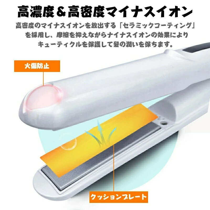 ◆◆商品詳細◆◆ 【3段階温度調節】 プロ仕様のヘアアイロンとして、160℃から200℃まで髪の状態や髪質に合わせて適切な温度に調節でき、温度指示ライトが付き、設定された温度を一目で分かり、過熱しないように知能的な温度制御チップが付き、髪の毛を傷つける心配が無く、安心して利用できます。 【ストレート&カール2way仕様】 ストレート?カールへの切替は自由です。このヘアアイロン一本で、ストレートだけでなくカールや外ハネヘアも可能です。縮毛矯正レベルの200℃を実現し、ご気分に合わせて髪スタイルの変更が簡単になります。 【マイナスイオンセラミック材質】 セラミックコーティングプレート式ヘアアイロン、導熱性に優れ、髪の潤いと艶を与えながら、髪質を損傷せずに美しいカールを作れる。引っかかりにくいなめらかな仕様で、髪にやさしくアレンジをスムーズに行うことができます。 【コードレス&持ち運びに便利】 コードレスのため、使用中に絡まる心配がありません。USB充電式なのでどこでも使えます。ミニサイズなので持ち転びやすく、カバンなどに入れても場所をとりません。忙しい朝でも、旅行/出張/デート前でも、スタイリングがすぐできます。注:機内持ち込み?お預けともにできませんのでご了承ください。 【急速加熱&安全】 プレート表面にはプロ仕様のセラミックコーティングが付き、滑りが良く、耐久性や熱伝導にも優れており、短時間でツヤサラに仕上がります。忙しい朝やデート前のちょっとした時間でも、スタイリングが可能です。ヘアアイロンの先端部にヤケド防止の設計があり、もっと安全に使用いただけます。