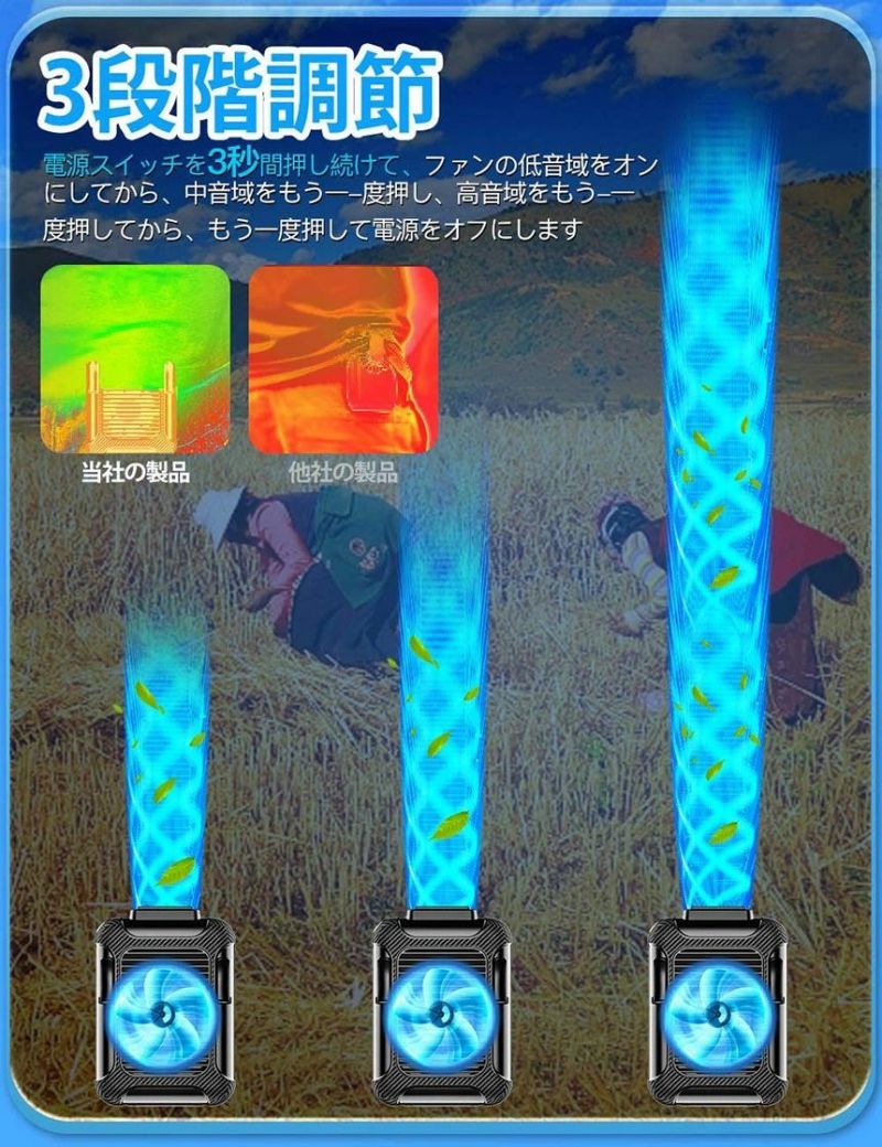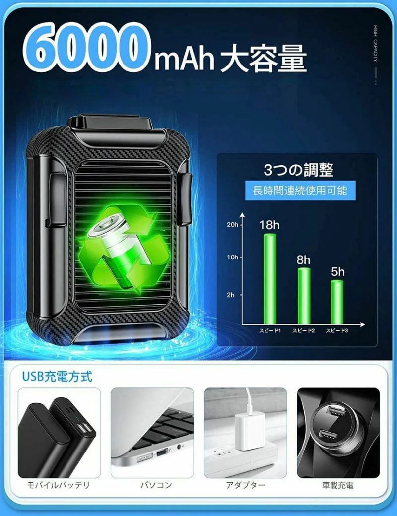 【大容量バッテリー6000mAh】:ファンから取り入れた空気を身体と服の間に流して、涼しく快適な環境にします。体のクリップ部分をズボンのベルトに引っ掛けるだけ!ファンから取り入れた空気を体と服の間に流して涼しくしてくれるジェットファンです!3段階風量の調節あり、夏日の熱さによって、いつでも風の強さをご調節使用できます。首掛け扇風機としても使用ができます。いつでもどこでも涼しくなります。USB充電4時間ぐらいに充電完了できます。 【作業服でも私服でも使用可能】:ベルトや安全帯に装着し、腰に掛けている時、ダブルクッリプ、風が背部や腹に吹くのはできます。ハンズフリーになります。アウトドアスポーツや作業の時にウエストに装着することができ、とても便利です。バッテリー内蔵タイプだからジャマになりにくく、着脱しやすいのも嬉しいですね.※ 注意:底の入風口を遮ないようにお願いします。 【3段階風量調節&便利なUSB充電】:風量は強、中、弱の3段階で調節可能です。使用時はお好みに合わせて自由に風量を調節できます。こまめに風量モードを切り替えることにより無駄な電力消費が抑えられます。 フル充電時で最大約16時間の連続動作が可能です。弱/16時間、中/5時間、強/3.3時間。USB充電方式を採用しています。付属のUSBケーブルでパソコン、モバイルバッテリー、ACアダプターなどで簡単に充電ができます。 【様々なシーンで】:コンパクトなのに強力な風量を実現。工事現場、厨房、農作業、配達作業、工場内、倉庫等々空調がむずかしい高温下での作業で大活躍です。お釣り,登山、遠足等のアウトドア活動にも熱中症対策品として活用可能です。バッテリー内蔵タイプだからジャマになりにくく、着脱しやすいのも嬉しいですね。 一台三役の多効能扇風機&風向き調整 ベルトファン: 本体のフック部をズボンのベルトに引っ掛けて適当な位置に調節するだけ、簡単に使用ができます。 首掛け扇風機: 付属のネックストラップを装着すれば、首掛け扇風機ができ上がりました。 卓上扇風機: 卓上用のスタンドを引き出して、卓上扇風機としても使用可能です。 腰掛け/首掛け/卓上扇風機の多用性を叶えています。 ※ 注意:底の入風口を遮ないようにお願いします。 本体サイズ(約):49×80×109mm 本体重量(約):260g(超軽量) バッテリー容量:6000mAh 出力電圧:5V 充電時間(約):4時間 風量調節:3段階(弱・中・強) パッケージ内容: 腰掛け扇風機x1、 説明書x1 USB専用充電ケーブルx1 ネックストラップx1