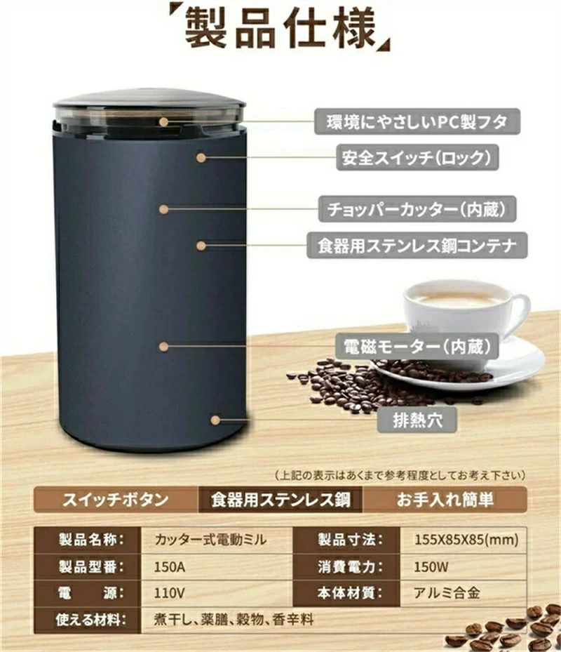 梱包サイズ:18.2 x 10.6 x 10.2 cm 素材:ステンレス 鋼 梱包重量:0.67kg 【パワフル】銅コイルモーターを搭載しており、SUS304ステンレス鋼で作られたチョッパーカッターにより 数秒回転するだけで食材を広範囲に細かく挽けます。旧モデルと違い、挽き具合をコントロールできるようになっています。 【水洗い可能な内びん】良好な熱安定性、耐食性と耐久性を持ち合わせしており、食器用の二重構造の容器になっています。 内びんは防水設計のため水洗いができます。汚れが取り除きやすく、お手入れが非常に楽です。 【安全設計】過負荷防止装置を搭載しており、連続運転時間が90秒を超えると運転が止まり、長く使えるように強制的に休ませる仕組みにしています。 また、より安全にお使いいただくために、誤動作防止機能を持たせており、フタをコンテナに正しく取りつけないとスイッチが入りません。 【ポータブル】挽き具合を随時確認できるように、フタを透明にしています。コンパクトで場所が取らず 研磨加工により置くだけでもインテリアな装飾品になります。 【幅広い汎用性】コーヒー豆だけでなく、緑大豆、黄大豆、ピーナッツ、ゴマ、お米、八角、唐辛子、胡椒、山椒、杏仁 香辛料など様々な食材を挽けます。おしゃれなデザインに高い機能性、女性が大喜びする素敵なプレゼントです。 注意事項 写真は実物と同じように撮影されます。撮影中の光とモニターの解像度が異なるため、多少の色の違いは品質上の問題ではございませんので、予めご了承ください。 製品の仕様は品質の向上・改善のため、予告なく変更される場合が御座います。 環境配慮と迅速なお届けのため、簡易包装で発送しております。万が一不具合やご不明点がございましたら、どうぞお気軽にご連絡ください。誠意をもって対応させていただきます。。 ※手動測定による1~2cmの誤差を許容してください。ご理解いただきありがとうございます ※輸入品の為、多少の汚れ、スレがある場合がございます。(製品の動作に問題ございません。) ※取り扱い上のご注意をよくお読みの上ご使用下さい。