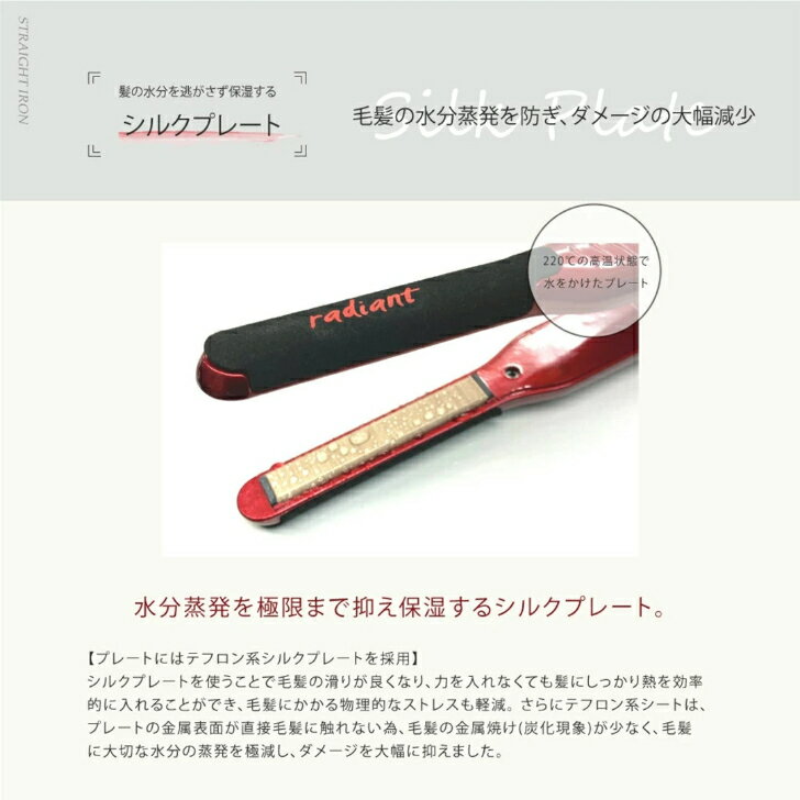 【送料無料】ラディアント radiant radiant mini シルクプロヘアアイロン 9mm サロン専売品 プロ用 美容師たちに絶大な人気を誇るシルクプロアイロン、極細9mmで創る究極のヘアデザイン 極細9mmで創る究極のヘアデザインシルクプレートストレートアイロン9mm極細タイプ。シルクプレート採用のヘアアイロンが髪を熱から守ります。パサつかないアイロンスタイリングが楽しめます。■シルクプレート機能で毛髪の摩擦によるダメージやストレスを大幅に軽減■テフロン系シートにより、金属焼けが少なく毛髪に大切な水分の蒸発を軽減■アイロンの温度が220℃に到達するまでの所要時間がなんと約30秒本体サイズ(高さ×幅×奥行)267mm×27mm×37mm本体重量 300gコード長さ 3.0mプレートサイズ 9mmプレート加工 シルクプレートイオン 有温度 130℃~220℃最高温度 201℃以上温度調節機能 あり立ち上がり時間 20秒自動オフ機能 あり開閉ロック 無電源方式 交流(コード)式使用可能電圧 AC100V消費電力 35W仕様1 電源ONから180℃まで約20秒仕様2 電源切り忘れ防止機能付き仕様3 ショートヘア向き 5