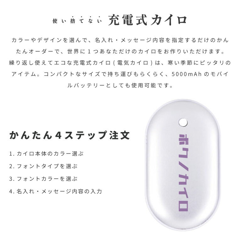 商品説明 あなただけのオリジナル充電式カイロを♪ カラーやデザインを選んで、名入れ・メッセージ内容を指定するだけのかんたんオーダーで、世界に1つあなただけのカイロをお作りいただけます。 繰り返し使えてエコな充電式カイロ(電気カイロ)は、寒い季節にピッタリのアイテム。 コンパクトなサイズで持ち運びもらくらく、5000mAhのモバイルバッテリーとしても使用可能です。安全な設計かつ簡単な操作で、お子様からお年寄りの方まで安心してご利用いただけます。 個人用はもちろん、記念品やギフトにも最適な、世界にたった一つだけのオリジナル充電式カイロを作りましょう! 商品詳細 [セット内容] カイロ本体 ×1 USB充電ケーブル ×1 [素材] アルミ合金 + ABS [サイズ] 約 102 × 59 × 25 (mm) [重量] 約 132g [印刷方法] UVインクジェット印刷(CMYK出力) ※印刷面は表面となります。 ※UV印刷とは紫外線を照射することで硬化するインキ(UVインキ)を使った印刷方式です。 注意事項 (※必ずお読みください) ・低温やけどにご注意ください。 ・バッグなどに入れているうちにスイッチが入る場合がございますのでご注意ください。 ・発熱など、製品に異常を感じた場合は、ただちにご使用をおやめください。 ・お子様が本体や付属品を飲み込んだ場合は、ただちに医療機関で治療を受けてください。 ・漏れた電解液が肌についたり目に入った場合は、こすらずに水で洗ってから、ただちに医療機関で治療を受けてください。 ・長時間使用しなかった場合、再使用の前にUSB出入力口などから汚れを取り除いてください。 ・温度が使用環境によって異なる場合もございます。 ・1時間に1回程度肌の状態に異常がないか確認し、異常があった場合はすぐに使用を中止してください。 ・熱いと感じたらすぐに使用を中止してください。 ・就寝時は使用しないでください。 ・肌の弱い方、子どもや身体の不自由な方、意思表示のできない方の使用は控えてください。 ・下着など薄い衣類の上から使用する場合は特に注意してください。 ・コタツ、ストーブなどの暖房器具の近くでは使用しないでください。 ・改造や、本来の目的以外のご使用、強い衝撃などはお控えください。 ・仕様は改善の為に予告なく変更する場合がございます。 ・受注生産商品となるため、ご注文確定後の変更・キャンセル・返品・交換はお受けできません。 ・ご覧いただくモニターやスマートフォン画面などの仕様により、掲載写真と実物に色味など多少の違いが発生する場合がございます。 キーワード 充電式カイロ 電気式カイロ 電気カイロ コンパクトサイズ 冬ギフト 冬プレゼント 寒い季節 かいろ 貼るカイロ 貼らないカイロ モバイルバッテリー 充電可能 PSE 認証済 名入れ 名前入り プレゼント ギフト 名入れ 名前入り 名前入れ name 文字入れ 文字入り メッセージ プリント 印刷 名前 ネーム 可愛い かわいい おしゃれ 男性 女性 メンズ レディース ウィメンズ ユニセックス かわいい カッコいい オシャレ シンプル 人気 送料無料 出産祝い 出産内祝い 結婚祝い 誕生日 プレゼント 贈り物 ギフト ペア お祝い お見舞い 就職祝い 歓送迎会 成人式 成人祝い 還暦祝い 敬老の日 記念日 出産記念品 結婚記念日 卒業記念品 感謝の気持ち バレンタインデー ホワイトデー 名入れ 母の日 父の日 敬老の日 名入れ ハロウィン クリスマス 退職祝い バレンタイン ホワイトデー 成人の日 子供の日 お中元 お歳暮 入学祝 進級祝い 就職祝い 結婚祝い 誕生祝 還暦祝い 定年祝い ノベルティ ラッピング 対応商品 【おすすめのイベント】 誕生日 バレンタインデー ホワイトデー クリスマス 出産祝い 出産祝 就職祝い 結婚祝い 結婚記念日 革婚式 記念日 敬老の日 母の日 父の日 成人祝い 卒業祝い 還暦祝い 退職祝い 引っ越し祝い 引越し祝い 引越祝い 新築祝い 入学祝い 進学祝い 進級祝い ごほうび 昇進祝い 合格祝い いい夫婦の日 退院祝い 転職祝い 送別会 歓迎会 寿退社 長寿祝いこちらは楕円タイプのページとなります。 スクエアタイプをご希望のお客様は、以下のリンクをご覧ください↓ 同デザイン、スクエアタイプはこちら▶