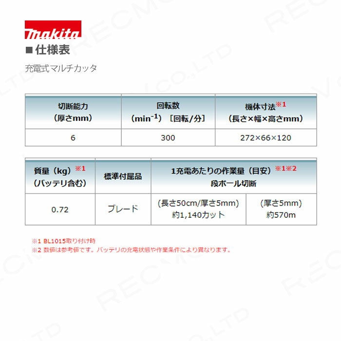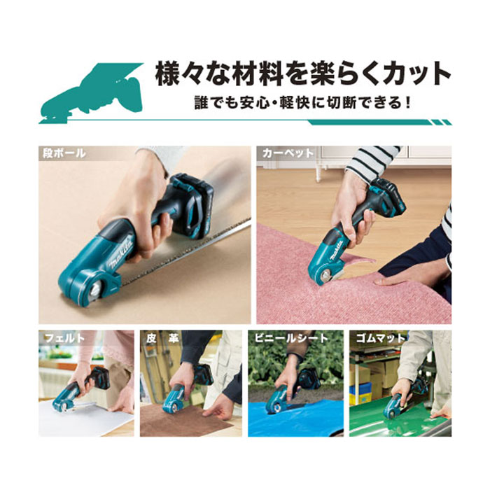 PSEマークの種類:PSE届出事業者名:株式会社マキタ■CP100DSH バッテリBL1015・充電器DC10SA・ソフトケース付 [約22分充電]リチウムイオンバッテリ10.8Vスライド式バッテリ切断能力(厚さ) 6mm回転数(min-1)[回転/分]:300機体寸法※1(長さ×幅×高さmm) 272×66×120質量※1(バッテリ含む) 0.72kg標準付属品:ブレード1充電あたりの作業量(目安)※1※2段ボール切断(長さ50cm/厚さ5mm) 約1,140カット(厚さ5mm) 約570m※1 BL1015取り付け時※2 数値は参考値です。バッテリの充電状態や作業条件により異なります。【標準付属品/消耗品】ブレードセット品部品番号 A-65707段ボール、カーペット等、様々な材料を楽らくカット!安心・軽快に切断できる!特長様々な材料を楽らくカット誰でも安心・軽快に切断できる!・段ボール、カーペット、フェルト、皮革、ビニールシート、ゴムマット豊富な作業量※BL1015使用時。数値は参考値です。段ボール切断(長さ50cm/厚さ5mm)約1,140カット(約570m)高速充電:約22分(BL1015充電時)圧倒的な互換性バッテリ1つで様々な工具が使える!(下記は一例です)・充電式インパクトドライバ(TD111D)・充電式ファン(CF100D)・充電式クリーナ(CL107FD)・充電式ミニ生垣バリカン(MUH264D)刃物位置目印カットラインに沿って切る時に便利。 自動研磨機能付切断面はいつもキレイ!切断する度にブレードを研磨。 ソフトケース付収納、持ち運びに便利。(DSHのみ)・握りやすいソフトグリップ・ロックオフボタン充電式工具にお悩みの方はこちら