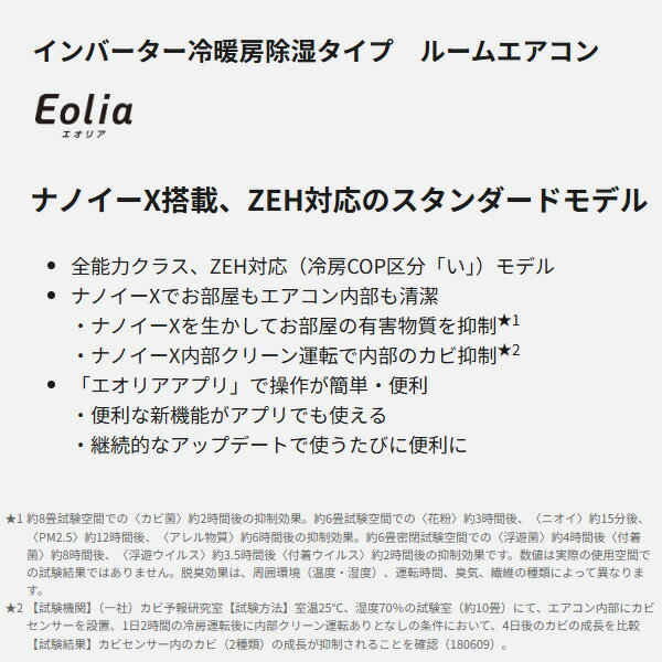 ■ Panasonic(パナソニック) ■ Eolia(エオリア) 2025年モデル Nシリーズ(住宅設備モデル)ナノイーX搭載、ZEH対応のスタンダードモデル◆ 主な特長 ◆インバーター冷暖房除湿タイプ ルームエアコン Eolia(エオリア)ナノイーX搭載、ZEH対応のスタンダードモデル●全能力クラス、ZEH対応(冷房COP区分「い」)モデル●ナノイーXでお部屋もエアコン内部も清潔・ナノイーXを生かしてお部屋の有害物質を抑制・ナノイーX内部クリーン運転で内部のカビ抑制●「エオリアアプリ」で操作が簡単・便利・便利な新機能がアプリでも使える・継続的なアップデートで使うたびに便利に◆ 主な仕様 ◆畳数の目安:おもに8畳 ・暖房:7〜9畳(12〜15平方メートル) ・冷房:7〜10畳(11〜17平方メートル)暖房能力:3.2(0.3〜6.3)kW外気温2℃時の暖房能力:5kW冷房能力:2.5(0.4〜3.2)kW消費電力… ・暖房時:640(105〜1990)W ・冷房時:500(110〜870)W電源:単相100V 20A / コンセント形状:アイエル型外形寸法… ・室内機:幅780×高さ290×奥行229mm ・室外機:幅780(バルブカバー+68、取っ手部+20.5)×高さ551×奥行289(前面:吹き出しグリル+39、背面:脚部+31.5)mm質量… ・室内機:9kg ・室外機:28kg最大配管長:20m(チャージレス10m)配管最大高低差:15m使用配管:2分3分配管簡易商品仕様シリーズ名:Eolia(パナソニック)ブランド名:Panasonic|パナソニックメーカー型番:CS-255DN-W代表カラー:ホワイトAPF(通年エネルギー消費効率):5.9エアコンのタイプ:壁掛け暖房の最大適用畳数(鉄筋):9畳暖房の最大適用畳数(木造):7畳冷房の最大適用畳数(鉄筋):10畳冷房の最大適用畳数(木造):7畳冷房能力:2.5kW年間電気代:21700円カラー:クリスタルホワイト<マット調>ブランド名(カナ):パナソニックシリーズ名(カナ):エオリア配送サービス:取付工事可|設置対応可省エネ目標年度:2027