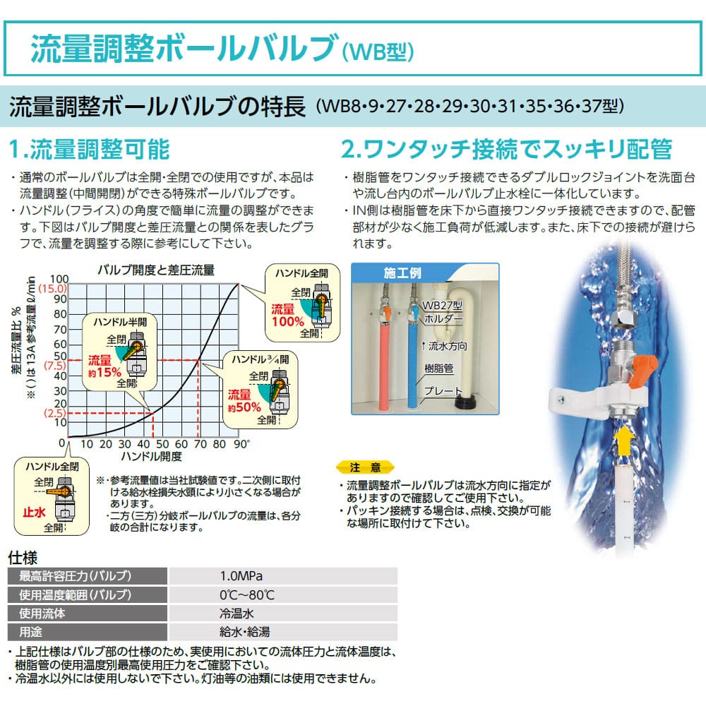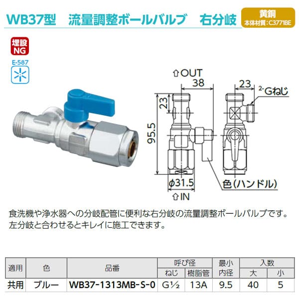 ●メーカー:オンダ製作所●品番:WB37-1313MB-S-0●日本水道協会認証登録品:E-587<商品情報>食洗機や浄水器への分岐配管に便利な右分岐の流量調整ボールバルブです。左分岐と合わせると綺麗に施工できます。●仕様・最高許容圧力(バルブ):1.0MPa・使用温度範囲(バルブ):0℃〜80℃・使用流体:冷温水・用途:給水・給湯●材質・黄銅:C3771BE●サイズ・適用:共用・呼び径 ねじ:G1/2・呼び径 樹脂管:13A・最小内径:9.5●注意・流量調整バルブボールバルブは流水方向に指定がありますので確認してご使用下さい。・パッキン接続する場合は、点検、交換が可能な場所に取付けて下さい。■キャンセル、返品、注意事項に関して※品番により、お時間をいただく場合がございます。メーカーお取り寄せ商品になりますので、ご注文後のお客様都合での返品・交換には応じかねます。クーリングオフでの適用は致しません。商品遅延による工事遅延損害は補償できません。商品画像はイメージです。商品名に記載されている品番通りに手配致します。