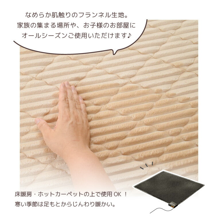 ■商品仕様(カバー) サイズ 約190cm×240cm 素材 表地/ポリエステル 100% 中材/ウレタンフォーム 裏地/不織布(滑り止め付き) 仕様 抗菌・防臭・防ダニ・低ホルムアルデヒド ※※※他店舗でも同時販売しておりますので、売り違い(売り切れ)の際にはご容赦くださいますようお願い致します。 ■商品仕様(ホットカーペット本体) サイズ 約176cm×235cm 素材 ポリエステル 100% 仕様 ※この製品は日本国内専用です。 ※1年保証の対象はホットカーペット本体のみとなります。 ・8時間オフタイマー付 ・ダニ退治機能付 ・暖面切替:全面、上半面、下半面の3面切換有 ・16折りコンパクト収納 ・電気コタツ、エアコンとの併用可。 ・本体定格:交流100V 480W ・温度 中40度・強45度 ※上記測定値は当社指定のカーペットカバーを使用したときの値です。 実際に使用されるときは、室温、床面など部屋の構造や使用環境によって値は変化します。 ※同梱の保証書は、不良品の交換や返品の際に必ず必要となります。大切に保管くださいますようお願い致します。紛失された場合、対応をお断りする場合がございます。 ■お洗濯についての注意 ・当商品は手洗いを推奨です。 洗濯機をご利用の際は、必ず【洗濯ネット】をご使用の上、手洗いモード等にてお洗濯を行って下さい。また、洗濯機自体の容量厳守・商品の洗濯表記をよくご確認頂き、お取り扱い下さい。 お洗濯による劣化や破損について、当店では補償できかねます。お客様の責任の下、行っていただきますようお願い申し上げます。 ・ホットカーペット本体は洗濯不可です。ご注意ください。 ■ご注文に際して ※1 掲載している商品画像は、実際の色味に近づくよう調整しておりますが、ご覧頂くモニターや、実際ご利用になる場所の光加減で左右されます。 ※2 カラー名は商品の色を特定するものではなく、管理上の表記としてのものです。 ※3 当商品は一部手作業により生産されており、縫製に若干の歪みや表示サイズに誤差(±数cm程度)がある場合がございます。 ※4 裏面の不織布のカラーは生産ロットによって変更となる場合があります。予めご了承くださいませ。 ※5 他店舗でも同時販売しておりますので、売り違い(売り切れ)の際にはご容赦くださいますようお願い致します※1年保証の対象はホットカーペット本体のみとなります。※