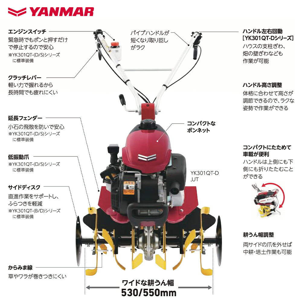 ●“握るとバック”を標準装備。後進・旋回がしやすく、狭い場所でも作業がラクラク!●サイドディスク・握るとバック・簡易フリフリ抵抗棒標準装備・販売型式名:YK301QT-B(握るとバック仕様)・全長x全幅x全高(mm):1185x610x1000・機体質量(kg):38・種類:空冷4サイクルOHVガソリンエンジン・総排気量L/{cc}:0.098{98}・定格出力/回転速度(kW{PS}/rpm):1.4{1.9}/1600・最大出力kW{PS}:2.2{3.0}・使用燃料:自動車用無鉛ガソリン・燃料タンク容量(L):1.0・始動方式:リコイルスタータ式・変速段数:前進1・後進1・爪回転外径(mm):φ300・爪軸形式:分割式・耕幅(mm):280・530・移動車輪:別売・ハンドル上下調節:菊座式無段階※北海道・沖縄・離島は別途中継料がかかります。※季節商品のため、在庫切れ及びお届けまでお時間いただく場合がございます。予めお急ぎの場合は在庫確認等お問い合わせください。 ※修理およびリコール等が発生した場合の送料等はお客様負担となります。予めご了承ください。