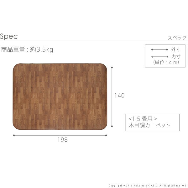 ※メーカー直送のため代金引換はお受けできません。 ※沖縄・一部離島は別途送料がかかります。お見積もりいたしますのでお問い合わせ下さい。 【カラーバリエーション】 ブラウン・ナチュラル・ホワイト 【仕様】 表面:塩化ビニール樹脂 中面:塩ビ発泡層 裏面:ポリエステル100%(不織布) 抗菌・防カビ・防汚 【サイズ】 幅198x奥行140cm重量:約3.5kg 株式会社ナカムラ(61600007)木目調ホットカーペットカバー [ウッディ] カバーのみ単品 >1畳用   >1.5畳用   >2畳用   >3畳用 木目調ホットカーペットカバー [ウッディ] + ホットカーペット セット >1畳用   >1.5畳用   >2畳用   >3畳用