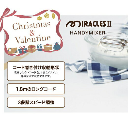 こちらはメーカー様よりお取り寄せの商品となりますので、在庫、納期状況につきましては細心の注意を払っておりますが、万が一、在庫切れ・販売終了等の際はキャンセルとなる場合がございます。 クッキー生地やスポンジ生地を作るのに最適な電動ハンドミキサー! 3段階スピード調整で、適度な泡立て、かくはんが可能です。 コードは本体にクルクル巻き付けてすっきり収納できます。 1.8mのロングコードで便利です。 製品サイズ:(約)幅7.5×奥行19×高さ23.5cm(ビーター含む) 製品重量:0.77kg(ビーター含む) 素材・材質:本体/ABS樹脂(耐熱温度80度)、ビーター/ステンレス鋼、電源:100V 50/60Hz、定格消費電力:70W、定格時間:7分 温度ヒューズ(125℃) 速度調節:3段階スピード、コード:1.8m 生産国:中国 ※ご注意 取扱説明書をよくご確認の上、ご使用ください。 初めて使う時に臭いが感じられることがありますが、ご使用とともになくなります。 定格時間を超えて使用した場合や、負荷の強い材料を使用した時など、モーターの温度が上昇すると過熱防止装置が働き、モーターが作動しないようになります。その場合はスイッチを切り、電源プラグをコンセントから抜いて本体(モーター)を冷まして(15分程度)ください。本体(モーター)が、冷えるとモーター過熱防止装置が解除され、再び作動します。 ※ご注文数量によっては送料が変更となる場合もございます。その場合は別途ご連絡致します。