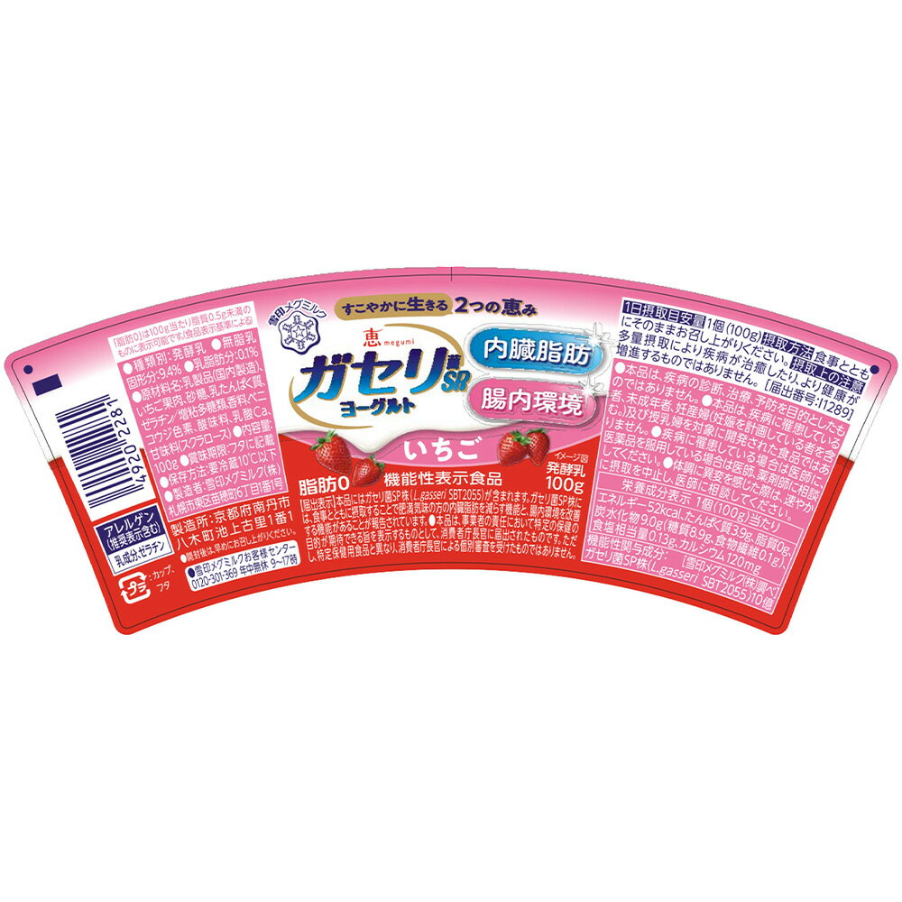内臓脂肪を減らし、腸内環境を改善するガセリ菌SP株入りヨーグルト、いちご果肉入りのソフトタイプ【ガセリ菌SP株入りヨーグルト】内臓脂肪を減らし、腸内環境を改善する ガセリ菌SP株 入りヨーグルトです。【機能性表示食品】ガセリ菌SP株には、食事とともに摂取することで肥満気味の方の内臓脂肪を減らす機能と、腸内環境を改善する機能があることが報告されています。【いちご】脂肪ゼロで毎日続けやすいヘルシー設計。いちご果肉入りのソフトタイプのヨーグルトです。 商品仕様・説明 メーカー名 雪印メグミルク日本MC☆ 原材料名 乳製品(国内製造)、いちご果肉、砂糖、乳たんぱく質、ゼラチン/増粘多糖類、香料、ベニコウジ色素、酸味料、乳酸Ca、甘味料 (スクラロース) アレルゲン 乳,ゼラチン 賞味期限 製造日から18日 保存方法 要冷蔵10℃以下で保存してください。 注意事項 【賞味期限:発送時点で9日以上】要冷蔵10℃以下 【ご注文前に必ずお読みください】・沖縄本島を含む離島、福島県や石川県の一部ほか配送を承っていない地域がございます。誠に恐れ入りますが、ご注文いただいた場合キャンセルさせていただくこととなりますので、何卒ご了承くださいますようお願いいたします。・基本的にご注文日から1~3営業日(土日祝除く)以内の発送となりますが、在庫状況によってはお取り寄せになるため予定より遅い発送となる場合がございます。また、天候および交通事情によりがお届け目安より発送(配送)が遅れる場合がございます。予めご了承のほどお願いいたします。・お手元に届いた時点で商品に問題等あった場合は、到着後3日以内にまずは当社までご連絡をお願いいたします。・冷凍/冷蔵/常温をまたいでご購入された場合は温度帯別に発送いたします。また、同じ温度帯の商品でも発送元が異なる場合は別配送となります。・メーカーの都合によりパッケージデザイン等が予告なく変更される場合がございます。予めご了承ください。