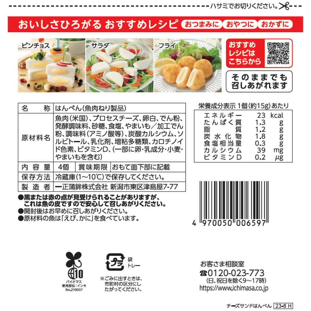 3種類のコクのあるチーズをサンドした、一口サイズのはんぺん。【お弁当に使えるはんぺんです】●はんぺん生地に、クリームチーズとチェダーチーズ、ゴーダチーズをブレンドしたプロセスチーズをサンドしました。●そのままおつまみに、お弁当にピッタリです。●骨の密度の維持と質を守るカルシウムとカルシウムの吸収をサポートし、骨へのカルシウム沈着を促進するビタミンDを添加しました。 商品仕様・説明 メーカー名 一正蒲鉾 原材料名 魚肉(米国)、プロセスチーズ、卵白、でん粉、発酵調味料、砂糖、食塩、やまいも/加工でん粉、調味料(アミノ酸等)、炭酸カルシウム、ソルビトール、乳化剤、増粘多糖類、カロチノイド色素、ビタミンD、(一部に卵・乳成分・小麦・やまいもを含む) アレルゲン 小麦,乳,卵,やまいも 賞味期限 製造日から14日 保存方法 冷蔵庫(1〜10℃)で保存してください。 注意事項 【賞味期限:発送時点で7日以上】開封後はお早めに召しあがりください。原材料の魚は「えび、かに」を食べています。 【ご注文前に必ずお読みください】・沖縄本島を含む離島、福島県や石川県の一部ほか配送を承っていない地域がございます。誠に恐れ入りますが、ご注文いただいた場合キャンセルさせていただくこととなりますので、何卒ご了承くださいますようお願いいたします。・基本的にご注文日から1~3営業日(土日祝除く)以内の発送となりますが、在庫状況によってはお取り寄せになるため予定より遅い発送となる場合がございます。また、天候および交通事情によりがお届け目安より発送(配送)が遅れる場合がございます。予めご了承のほどお願いいたします。・お手元に届いた時点で商品に問題等あった場合は、到着後3日以内にまずは当社までご連絡をお願いいたします。・冷凍/冷蔵/常温をまたいでご購入された場合は温度帯別に発送いたします。また、同じ温度帯の商品でも発送元が異なる場合は別配送となります。・メーカーの都合によりパッケージデザイン等が予告なく変更される場合がございます。予めご了承ください。