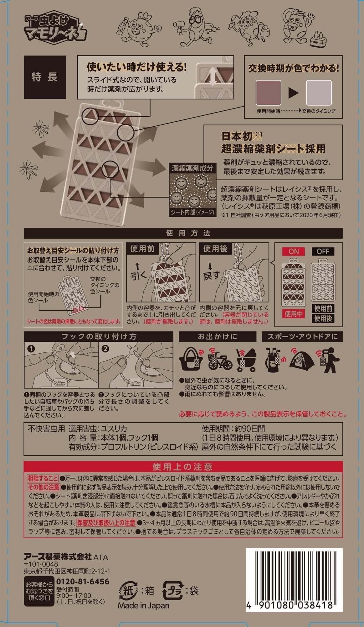 コールマンとコラボ! お肌にぬらずに虫よけ。アウトドア仕様のデザイン性の高い、ぶら下げるタイプの虫よけ。どこでも使えて、使いたい時だけ使える虫よけミニプレートスライド式なので、開いている時だけ薬剤が広がります。超濃縮薬剤シート採用:薬剤がギュッと濃縮されているので、最後まで安定した効果が持続※超濃縮薬剤シートはレイシス(R)を採用し、薬剤の揮散量が一定となるシート(レイシス(R)は萩原工場(株)の登録商標)ColemanはThe Coleman Company, Inc.の商標です。【効果持続期間】約90日(1日8時間使用)【適用害虫】ユスリカ【内容量】本体1個、フック1個