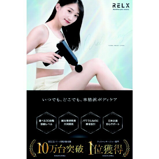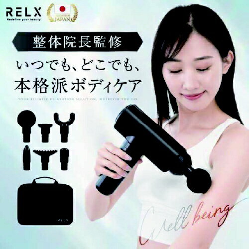 ■整体院長監修RELX(リラクス)TOTAL BODY CAREはジムやゴルフなどの運動後や仕事終わりの疲れた足、肩、首などの気になる部位にプロの整体のような本格ボディケアをご体感いただけます。■パワフルなのに静音設計最大3,600回/分の強力振動がより力強く、より深くまでアプローチ。また、動作音は55dB(日常会話の音量)以下と静音設計で、場所や時間を問わず使用できます。コンパクトに持ち運べる収納バッグ付き。■6種類の豊富なアタッチメント「球形」太もも・背中・臀部など大きな筋肉に。「円すい形」手のひら・足裏などピンポイントを刺激したいときに。「U字形」腕・すね・足首など細めの筋肉に。「平形」ふくらはぎ・二の腕など筋肉が多い部位に。「平面型」内ももや腰など、幅広い部位に。「指型」肩や腕などあらゆる部位に。■簡単操作電源マークを長押し(約2秒)して電源をオンにします。電源がオンになると液晶ディスプレイにバッテリー残量と強さレベルが表示されます。本体起動時、メモリー機能により前回使用いただいた振動レベルからご使用いただけます。※バッテリーが20%未満になると画面が点滅します。振動レベルを変えたい時は、(+)(-)マークを押すことで振動レベルを調整してください。振動レベルは1?30レベルまでございます。 30段階の振動レベルからその日の疲れに合わせてご調整が可能です。 (+)マークを押すたびに振動レベルが1レベルずつ上がります。 (-)マークを押すたびに振動レベルが1レベルずつ下がります。■使い方3STEP1、電源がオフになっていることを確認し、差込口にアタッチメントを奥まで差し込みます。2、電源マークを長押し(約2秒)して電源を入れます。電源が入ると液晶画面がつくので(+)(-)マークを押してお好みの強さに設定してください。3、ご使用になられる部位に軽くあててお使いください。※1回の使用時間は10分以内を目安とし、1日あたりの使用回数は2回までとしてください。(15分で自動オフタイマー機能付き) また、同一箇所への連続使用は、3分以内を目安としてください。※顔へのご使用はおやめください。■大容量バッテリー充電時間は約4.5時間で、約1.5時間使用可能。※本製品の使用頻度や使用レベルによって異なります。※表示の充電時間はDC5V2AのACアダプターで充電した場合。※充電時は必ずDC5V1A-2A対応のACアダプターもしくはUSBポートをご使用ください。※初めての充電時や長期間使用しなかった場合、充電時間や使用時間が目安と大きく異る場合がありますが、通常何度か充電や使用を繰り返すと正常に戻ります。■付属品と保証本体×1・充電用USBコード・アタッチメント×6・日本語取扱説明書(保証書付き) お買い上げから最大1年以内に故障が発生した場合は、修理・交換いたします。修理・交換の際には保証書の提示が必要となりますので大切に保管していただきますようお願い申し上げます。※定格電源DC5V-2A以上の出力では正常に充電できない場合がありますので充電時には定格電源DC5V-2A以下のものをご使用ください。