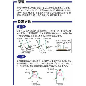 発酵活性微生物の力を借りて有機質の生ゴミを発酵分解し、生ゴミの減量化と堆肥に変える生ゴミ処理容器です。【用途】一般家庭(4〜6人)●生ゴミを手軽に毎日処理できます。●犬、猫、鳥等によるくいちらかしが防止できます。●臭いが抑えられます。●生ゴミの運搬・焼却のムダがなくなります。●豊かな土壌が再現されます。●据え付けが容易です。●うじ返し設計。【注意】●本品生ゴミ処理専用の容器ですので、それ以外の目的ではご使用にならないで下さい。●生ゴミを投入したら速やかに手を洗ってください。●生ゴミ投入後ふたは必ず閉めて下さい。※時間指定については、午前・午後の希望をあくまで「送り状に明記するのみ」となり、確約はできませんのでご了承ください。サイズ個装サイズ:66×60×60cm重量個装重量:3220g生産国日本fk094igrjs