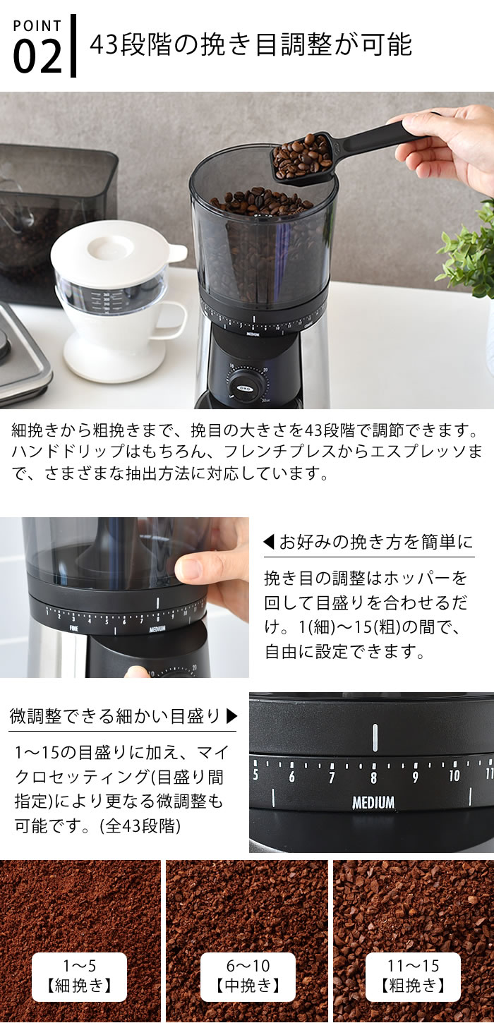 商品名OXO オクソー タイマー式コーヒーグラインダー商品詳細サイズ約 W13.5×D19.5×H33cm(収納時の高さ:約19.5cm)重量約2kg容量約340g素材豆ホッパー:AS樹脂・ABS樹脂・ナイロン・ステンレス鋼本体:ABS樹脂・ステンレス鋼・ナイロン他外刃(取り外し可):ナイロン・ステンレス鋼コーヒー粉コンテナ:ステンレス鋼・飽和ポリエステル樹脂スプーン:ABS樹脂電源100V 50/60Hz消費電力100Wコードの長さ約1m仕様●43段階の挽き目調整●コニカルバー式●タイマー機能付き原産国中国備考■電源プラグをコンセントに差したまま豆ホッパーを取り外したり、内部に指などを入れないでください。■グラインダー内部に水分を入れないでください。■焙煎済コーヒー豆以外には使用しないでください。■一度に決められた容量以上のコーヒー豆を挽かないでください。■お手入れの際は必ず取扱説明書の注意事項に従ってください。検索キーワード OXO オクソー タイマー式コーヒーグラインダー コーヒーミル 電動 豆挽き おしゃれ スタイリッシュ 家カフェ コーヒー豆 お手入れ簡単ラッピングラッピングOK→詳細はこちらOXO オクソー タイマー式コーヒーグラインダー43段階の挽き目調整が可能タイマー式コーヒーグラインダーフレンチプレスからエスプレッソまで、均一なサイズで挽くことができる丈夫なコニカルバー式のグラインダー。最大30秒まで時間で挽き量を調節できます。コーヒー粉のコンテナは帯電を抑えるステンレス製で、ぴったりと本体に装着でき、コーヒー粉の飛び散りを最小限に抑えます。紫外線カット効果のあるホッパーには底面のトラップドアがついており、取り外す際に豆がこぼれ落ちない設計です。刃は取り外してお手入れが可能です◎関連商品OXO オクソー タイマー式コーヒーグラインダーOXO オクソー ドリップケトル 温度調整&タイマー機能付OXO オクソー コーヒー&ティーポップコンテナ レクタングル ショート コーヒースクープ付→シリーズ一覧を見る
