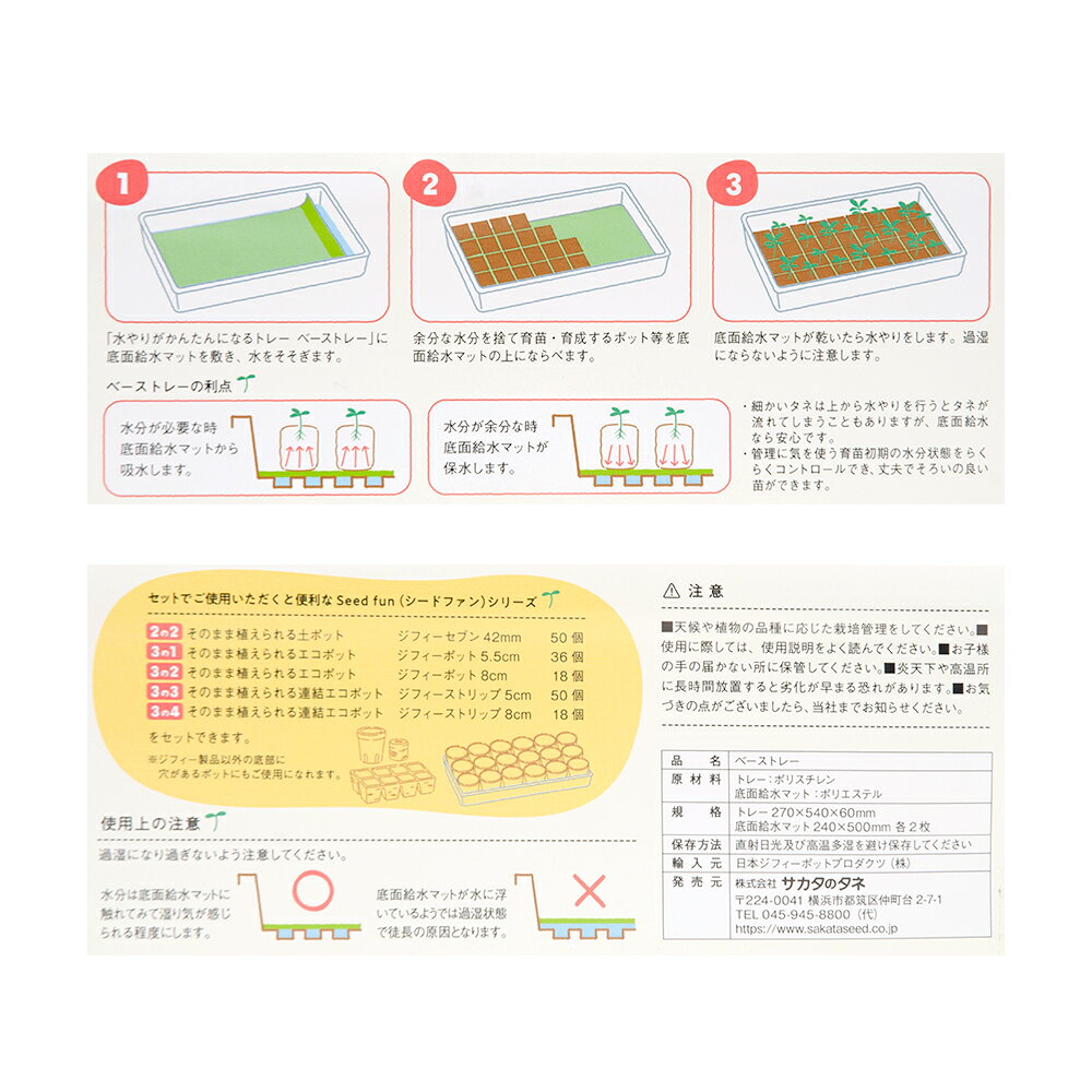 メーカー:サカタのタネ底面からムリなくムダなく水分コントロール!サカタのタネ ジフィーベーストレー 2枚入り対象花、野菜、ハーブなど特長●育苗用のマットとトレーのセットです。●花・野菜・ハーブの育苗、育成にオススメです。セット内容トレー・底面給水マット 各2枚サイズ(約)トレー:幅27.0×奥行き54.0×高さ6cm底面給水マット:幅24.0×奥行き50.0cm材質トレー:ポリスチレン底面給水マット:ポリエステルご使用方法●トレーに底面給水マットを敷き、水をそそぎます。●余分な水分を捨てて育苗・育成するポットなどを底面給水マットの上に並べます。●底面給水マットが傾いたら水やりをします。過湿にならないように注意します。ご注意※本品は園芸用品です。目的以外の用途では使用しないでください。サカタのタネ ジフィーハーフトレー培養土 サカタのタネ ジフィーミックス 4L かんたんタネまき・さし芽の土培養土 サカタのタネ ジフィーミックス 12L かんたんタネまき・さし芽の土 … サカタのタネ ジフィーベーストレー 2枚入り 4974449006304 20200507 GBNM ガーデニング 園芸用品 鉢 皿 鉢カバー ポット 種まき 育苗トレー 苗床 育苗 栽培 苗 opa2_delete インドアガーデニング 室内ガーデニング インドアグリーン グリーンインテリア 室内 インドア y20m02■この商品をお買い上げのお客様は、下記商品もお買い上げです。※この商品には付属しません。■サカタのタネ ジフィーハーフトレー培養土 サカタのタネ ジフィーミックス 4L かんたんタネまき・さし芽の土培養土 サカタのタネ ジフィーミックス 12L かんたんタネまき・さし芽の土