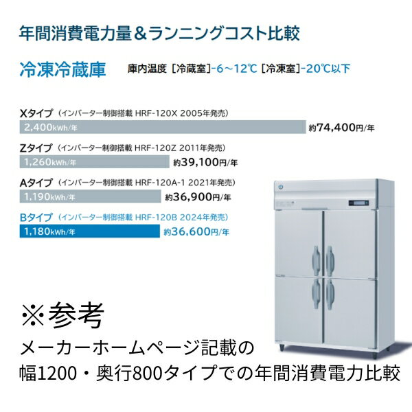 製品スペック メーカー型番 ホシザキ HRF-63B-ED 外形寸法 幅625×奥行800×高さ1910mm 定格内容積 453L (冷蔵225L,冷凍228L) 庫内温度 冷蔵室:-6〜12℃ ※(周囲温度30℃) 冷凍室:-25〜-7℃ ※(周囲温度30℃) 外装 ステンレス鋼板・亜鉛合板(後板・底板) 多層クリアコートステンレス鋼板※ ※(扉・フロントパネル) 内装 ステンレス鋼板・ABS樹脂 断熱材 硬質ポリウレタン一体発泡 電源 単相100V 50/60Hz 容量 0.65kVA(6.5A) 消費電力 冷却時 196/196W 霜取時 414/414W 地球温暖化に与える影響を示すもの。「S」は最も影響が少ない。 電源コード 2.3m (L形プラグ付) 冷媒 R600a 棚網 棚網2枚+スノコ2枚 ※棚網追加は有料オプション 付属品 ドレンジョイント一式 ドレンホース2本 製品質量 92kg(梱包時約97kg) ホシザキの業務用冷凍冷蔵庫 HRF-63B-ED は、幅625mm×奥行800mm×高さ1910mmのコンパクトな縦型モデルです。冷蔵室と冷凍室が上下に分かれ、それぞれ同じ容量を持つEDタイプで、バランスよく食材を保存できます。冷蔵室は-6〜12度、冷凍室はマイナス20度以下に設定可能で、鮮度をしっかり保ちます。インバーター制御により高効率運転が可能で、消費電力の削減にも貢献。冷媒には自然冷媒R600a(イソブタン)を採用。庫内は清掃性に優れたステンレス仕様で、衛生管理も容易です。飲食店や食品加工施設など、限られたスペースでも使いやすい信頼の一台です。 メーカー希望小売価格はメーカーカタログに基づいて掲載しています 関連商品HRF-63BT ホシザキ 自然冷媒冷凍冷蔵庫 業務用冷蔵庫 ノンフロ...HRF-63BT-ED ホシザキ 自然冷媒冷凍冷蔵庫 業務用冷蔵庫 ノ...303,034円298,435円HRF-63B ホシザキ 自然冷媒冷凍冷蔵庫 業務用冷蔵庫 ノンフロン...HRF-75B ホシザキ 自然冷媒冷凍冷蔵庫 業務用冷蔵庫 ノンフロン...309,135円332,255円HRF-75BT ホシザキ 自然冷媒冷凍冷蔵庫 業務用冷蔵庫 ノンフロ...HRF-90B ホシザキ 自然冷媒冷凍冷蔵庫 業務用冷蔵庫 ノンフロン...332,290円347,099円HRF-90BT ホシザキ 自然冷媒冷凍冷蔵庫 業務用冷蔵庫 ノンフロ...HRF-90BFT ホシザキ 自然冷媒冷凍冷蔵庫 業務用冷蔵庫 ノンフ...337,042円347,777円HRF-120BT ホシザキ 自然冷媒冷凍冷蔵庫 業務用冷蔵庫 ノンフ...HRF-63B-ED-L 左開き仕様 ホシザキ 自然冷媒冷凍冷蔵庫 業...341,902円366,500円■搬入/設置/入替工事等(※別料金)をご希望の場合はお問合せください。 ・不要の場合:車上渡し便でのお届けとなります。 ・設置等希望の場合:【別料金】となりますのでお見積り致します。■日中連絡のつく電話番号をご登録ください。 「冷凍庫の故障で食材が全滅…」 「冷却力が弱くて食材が保てない…」 そんな現場の声を何百と聞いてきた私たちが、 自信を持っておすすめするのが、 ホシザキ製・自然冷媒縦型冷凍冷蔵庫です。 🏆【国内シェアNo.1の信頼と実績】 全国の飲食店・ホテル・医療施設など、 プロの現場で圧倒的に選ばれ続ける 冷機機器ブランド「ホシザキ」。 🔧【安心の全国サポート体制】 トラブル時も全国サポート網で対応。 “冷えない=営業できない”リスクを最小限に抑える、 確かなアフターサービスが最大の強みです。 📈【環境とコストにやさしい次世代冷媒】 冷却性能を犠牲にせず、 地球温暖化への影響が極めて低い自然冷媒を採用。 CO2排出削減と省エネを両立した環境対応モデルです。 ✅【優れた冷却性能と衛生設計】 周囲温度や使用頻度に左右されにくい安定した冷却力、 食材の鮮度を守る耐久性・衛生構造、 清掃・メンテナンス性にも優れた業務用仕様 【正規販売代理店の当店だからこそ】 ・メーカー保証対応OK(※保証期間・適応外は有料) ・型番に応じた設置・納期のご相談も可能 ・自然冷媒機器の導入サポート実績も多数 🏆【持続可能な厨房へ、ホシザキの自然冷媒冷凍冷蔵庫】 環境にやさしく、しっかり冷える。 未来の厨房にふさわしい、信頼の1台を正規ルートでお届けします。