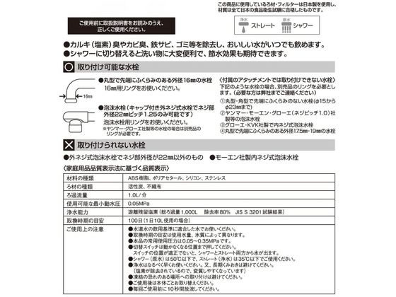 【商品説明】●カルキ臭・カビ臭・鉄サビなどを除去します。●低水圧でも勢いのいいシャワーです。●節水ユニットを使用して、シャワーに切り替えると使用流量が約60%節水できます。【仕様】●サイズ:約65×72×高さ60mm●内容量:1個●材質・・・ABS樹脂、ポリアセタール、シリコン、ステンレス、NBR、活性炭、不織布●取り付け可能水栓:先端にふくらみのある外径16mmの丸型自在水栓、外ネジ式泡沫水栓(ネジ部外径22mm・ネジ山ピッチ1.25)使用可能温度:浄水35℃/原水50℃水流:シャワー・ストレート使用ろ材:活性炭交換時期の目安:約3か月(1日10L使用の場合)●生産国:中国【備考】※メーカーの都合により、パッケージ・仕様等は予告なく変更になる場合がございます。【検索用キーワード】クリタック Kuritac くりたっく Kurita ロカシャワーCP3 浄水器 蛇口 水道 浄水 浄水蛇口 RSCP−3090 蛇口直結型 キッチン家電 浄水器本体 R8487Rシンクが広く使えるコンパクトタイプの浄水器!