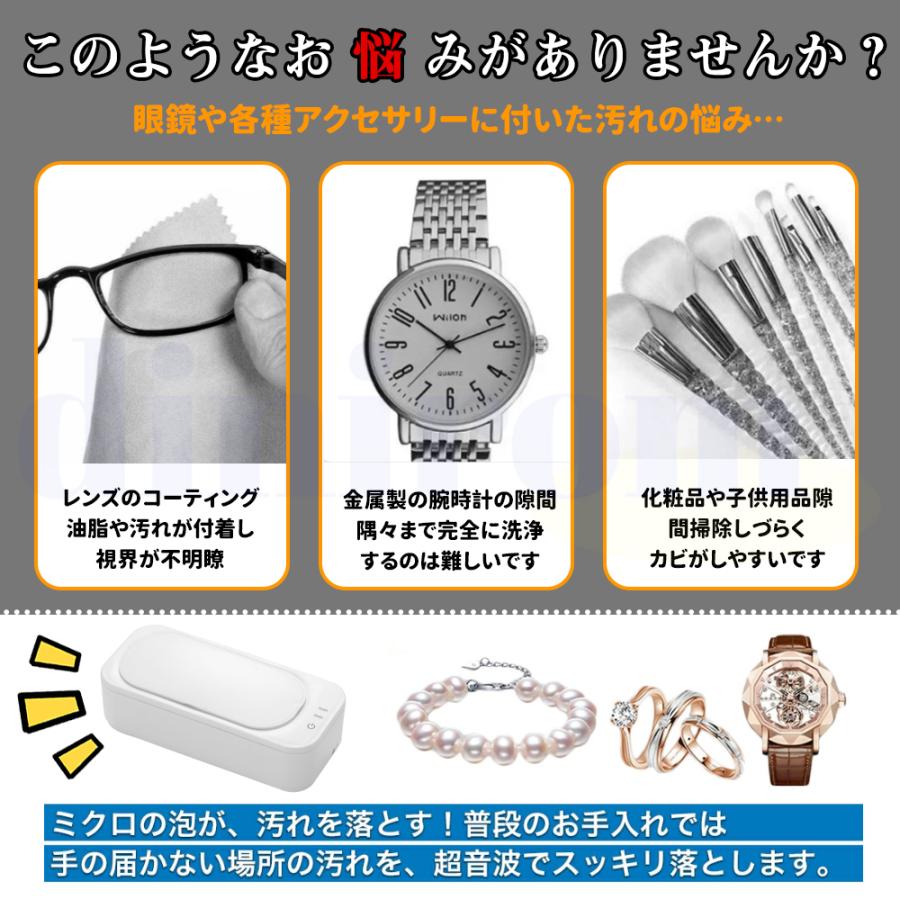 【360°全方位洗浄】超音波洗浄機の洗浄力は最強周波数の47,000Hzで、ほこり、バクテリアなど急速に取り除き、長時間の浸漬も必要がない。あっという間に手洗いが難しい汚れもキレイに洗浄できます。【2つの洗浄ムード】超音波洗浄器快速洗浄(3min)と深度洗浄(5min)があり、汚れに応じて選択できます。ワンタッチボタンで2段階調整可能スイッチを1回押すと電源を入れ、快速洗浄(3min)になる。もう1回押すと、深度洗浄(5min)になる。【コンパクト】超音波洗浄機軽量サイズで、軽く小型で持ち運びが容易です。旅行や出張先にもっていくことが出来ます!経済的で環境にも優しい!.【適用範囲広い】超音波洗浄機メガネの日常洗浄はもちろん、アクセサリー、防水腕時計、入れ歯などの洗浄にも役に立ちます。 メッキを使ったアクセサリーも対応できます。【超音波洗浄機使い方簡単】1、電源に接続します。2、蓋を開けて水また洗浄液を注入します。3、汚れ物を洗浄槽に入れます。4、ワンタッチで洗浄を開始して、時間を選び、蓋を閉じます。5、終わると自動的に電源が切れます。