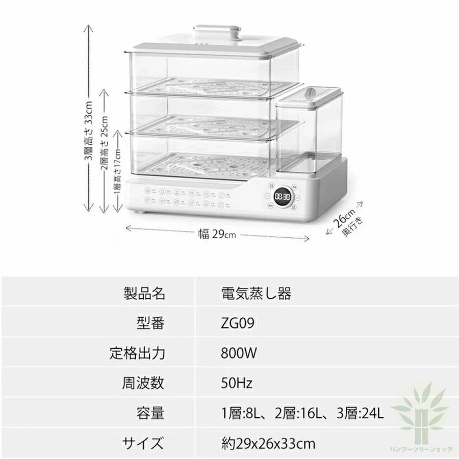 【新品登場】蒸し器 24L 大容量 電気蒸し器 3段 多機能 スチームクッカー 電気スチーム蒸し器 蒸し料理用アミ 自動電源オフ タイマー付 調理家電 蒸し鍋 1.5L独立水タンク 家庭用 24L容量の800W食品蒸し器 スチームクッキングマシン
