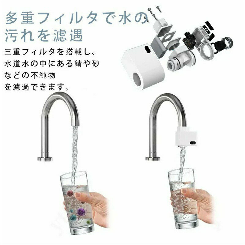 ●便利設計: 通常の水栓を5分間でセンサー水栓にアップグレード!自動蛇口が衛生的で便利、接触を減少させるため細菌抑制の作用もあり、蛇口やシンクなども汚さずに清潔に保てる以外に余計なお清掃不要! ●簡単取付: 2021最新型自動水栓!M24&M22の2タイプアダプター&3種類のワッシャーが付属され、直径20mm-24mmの蛇口に適合する。組み立て式で取り付けが非常に簡単で、女性でも5分間取り付け完了、インストールの時間も楽しめます。 ●節水効果: 人体や物品などが蛇口下部のセンサーに検知される時にインスタントに給水、右側のセンサーに検知されると3分間の連続給水が実現でき、二重の給水モードがあります。 ●USB充電式: 自動蛇口内部でリチウム電池が内臓され、乾電池が必要がありません。充電用のmicro usbケーブルが付きません、一回で3時間の充電で半年の連続使用が可能なので、優れた節電効果も期待できます。(ご注意:使用前3時間の充電が必要です。)