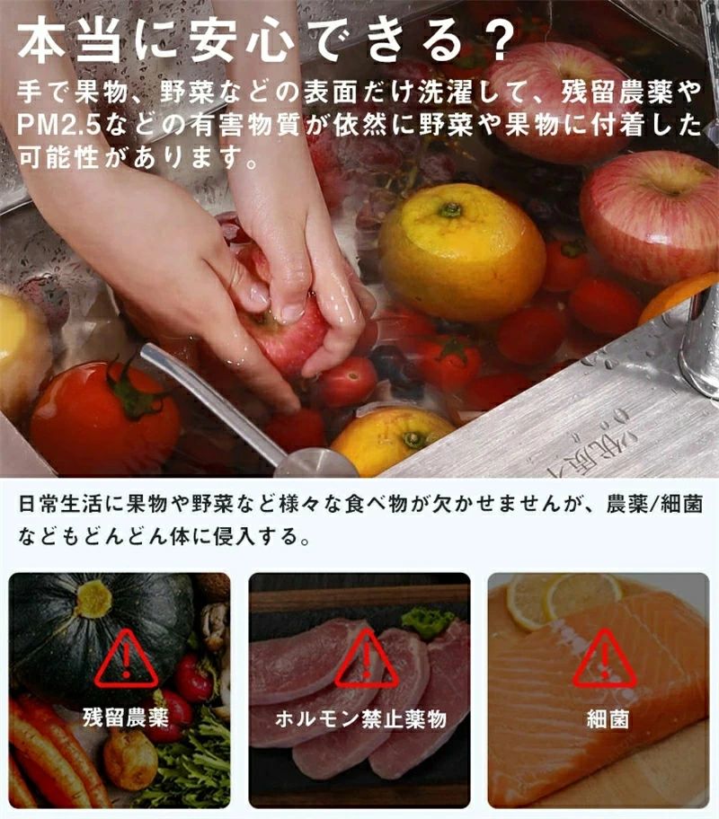 商品説明: 野菜や果物に付着した残留農薬やPM2.5(微小粒子状物質)などの有害物質を洗浄するハンディ型野菜洗浄機です。水中に浸けた野菜や果実から、超音波振動により残留農薬やPM2.5を落とし、滅菌率99.9%、ホルモンを分解、農薬を除去、除菌・消毒、栄養の保持します。 商品仕様: 製品名:果物・野菜超音波洗浄機 素材:ABS+電子部品 サイズ:145*56*56mm 電池容量:4000mAH 重さ:約410g 防水レベル:IPX7 カラー:ホワイト、ブルー、ブラック 商品特徴: 【果物・野菜超音波洗浄機】 ヒドロキシル水イオン精製技術と超音波技術で残留農薬を深く除去し、食品の味や栄養を傷つけずに迅速にホルモンを分解し、99.9% の滅菌効果があり、児童と家庭の健康をより安全に管理します。 【ワイヤレス充電& IPX7防水】 4000mah充電式バッテリー、ワイヤレス充電設計は、完全に充電されたときに20回使用できます。 IPX7防水設計、水漏れなし、安全に使用できる、バケツ、洗面台、シンクなどで使用できます。 【コンパクト】 ポータブルでコンパクト、ポケットやハンドバッグに収まり、携帯電話よりも小型です。出張やキャンプ、アウトドア旅行などに適しています。 【幅広い用途】 このポータブル野菜洗濯機は、家庭、キッチン、寝室で使用できます。食器、果物や野菜、台所用品、ボトル、米、魚、肉、シーフード、食品などを掃除するために広く使用されています。 【安心保証】 ※正常使用での不具合の場合、保証期間は商品到着後の6ヶ月でございます。 ※商品の品質については万全を期しており、万が一お届けの商品が不具合や破損等ございましたら、お手数ですが、弊社までご連絡頂きますようお願い致します。