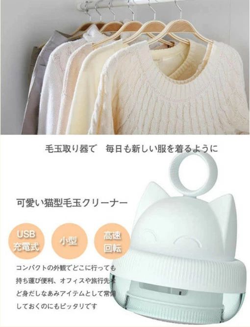 商品情報 商品紹介 商品名:毛玉取り機 入力:DC/5V-0.6A 素材:ABS 本体寸法(約):105*83*83mm 消費電力:5W バッテリー容量:500mAh 充電式:USB充電 充電時間:約70分 動作時間(約):約70分(フル充電) 重さ:約160g 生産国:中国 【可愛い猫型】 コンパクトの外観でどこに行っても持ち運び便利、オフィスや旅行先など身 だしなあみアイテムとして常備しておくのにもピッタリです 【使用便利】 USB充電式のデザインでプラグインして使用する必要はありません。500mAh 容量のバッテリーを搭載し、完全に充電すると約1時間連続使用できます。 広い面積で毛玉をカットできる毛玉取り器は効率よく仕上げることがで頑固な 毛玉は隠れるところがありません 【安全機能】 カバーを開いてクリーニングすると、ブレードの動作がすぐに停止します。偶発 的な怪我を防ぐために、カバーを覆うことによってのみ開始できます。 【大容量毛玉収納ボックス】 多くの毛玉を収納でき、時計回りに回して毛玉収納ボックスを開き、毛玉を捨てる ことができます。 ご注意: ※着たままの衣類に使用しないでください。 ※手やひざの上に衣類をのせてしようしないでください。けがをする恐れがあります。 ※バッテリー完全切れた場合、必ず30分充電して、その後、充電しながら使用も可能です。 ◆モニターにより色の見え方が実際の商品と多少異なることがございます。予めご了承ください。