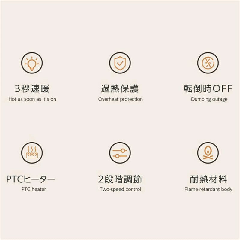 商品仕様 商品説明 コンパクトなのに、パワフル温風でしっかり暖かく ♪ 丸いスタンドは揺れに強く、本体を安定して支えます。欲しかったあの場所、この場所に。テーブルやデスクの上に乗せて指先の冷えやかじかみに温かい風を。冷えを感じやすい足元に設置するとより温かさを実感できます。 3秒で速暖 新技術、高い熱効率と安全性を兼備した性能。瞬時に温風を吹き出して暖めます。 立ち上がりが遅くて寒さを我慢する必要はありません。 風量2段階調節 上下ボタンで簡単操作、2段階温風調整。お好みに合わせて自由に使用モードを調節。置き場所を選ばず、どこでも暖かい空間に隅々まで届ける加熱力です。 安心・安全 地震や衝突など万が一ヒーターが転倒してしまった場合、スイッチが作動して自動的に電源がOFFになります。75°C過熱保護:自動制御で安全・安心。温もりを届け、安全も見守ります。 製品仕様 サイズ:約W15xD10.6xH20.1cm カラー:ホワイト 材質:難燃性PP、PTC(ヒーター) 重量:約0.6kg 電源コード長さ:約1.3m