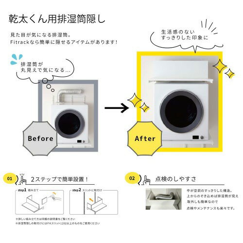 商品説明キャッチコピー乾太くんを気軽に。もっと簡単に。 壁面収納システム「Fitrack」でガス衣類乾燥機「乾太くん」が気軽にお家にやってきます。 設置も乾燥も手間のかからない快適な洗濯ライフを。特徴見た目が気になる排湿筒を隠せるカバーです。生活感のないすっきりした印象に!サイズW750×D300×H250mm色ホワイト付属品排湿筒隠し 1セット*取付ビスセット付き注意事項※取り付け寸法、下地の有無、施工については現場の状況をご確認いただいたうえで、ご発注ください。※乾太くん本体・専用台は付属しておりません。排湿筒のみの販売となります。※TSセット(乾太くん用)は乾太くんにガス管を取付けるので棚の移動ができません。※取付け推奨寸法は製品幅+3cm、高さ+15cmです。