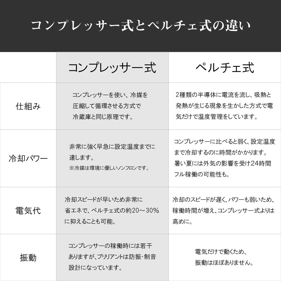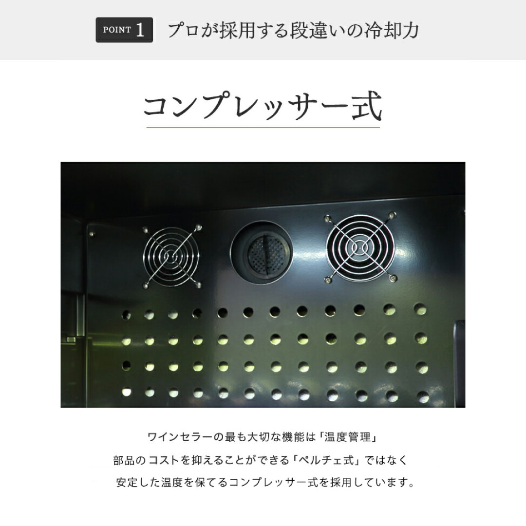 #ワインセラー #コンプレッサー式 #28本収納 #スリム設計 #前面排気 #最長5年保証 #省エネ 〔商品情報〕 「ファンヴィーノ28 (BU-88)」は、狭い住空間や店舗でも設置しやすい幅380mmのスリム設計を追求しつつ、最大28本のワインを収納できる本格派セラーです。冷却方式には、プロの現場でも採用される「コンプレッサー式」を採用。冷蔵庫と同じ原理で冷媒を循環させるこの方式は、外気温の影響を受けやすいペルチェ式に比べ、設定温度(5℃~22℃)まで早急に達し、安定した温度を維持する段違いの冷却力が特長です。これにより、暑い夏でも外気の影響を受けにくく、ペルチェ式に比べ電気代を20~30%抑えることも可能な、非常に省エネなモデルとなっています。庫内灯の操作や、5℃から22℃まで1℃刻みの詳細な温度設定も、タッチパネルで簡単に行えます。 〔メーカーのこだわり〕 このセラーの製造において最も注力しているのは、ご家庭で安心して長期貯蔵を可能にすることです。ワインの点滴である紫外線を防ぐUVカット二重ガラスを前面に採用し、品質を守ります。また、設置時のこだわりとして、コンプレッサーの熱をセラー前面下から排気する前面排気タイプを採用。これにより、背面・両サイドともわずか3cmのスペースがあれば設置できるため、省スペースでの設置が可能です。さらに、ご購入後も長く安心してご愛用いただくため、冷媒循環回路に対しては最長5年間という業界最長クラスの長期保証を設けています。不具合の際には、商品に精通した担当者によるきめ細やかなアフターサービスをご提供します。 本体サイズ 幅380x奥行570x高さ853mm 容量・重量 90L・約40kg 収納本数:最大28本 内寸:幅310×奥行440(最下部310)×高さ693mm 設定可能温度:5℃~22℃(外気温25℃の場合) 推奨設定温度帯:7℃~18℃ 定格消費電力:120W 年間消費電力:179kWh 冷却方式:コンプレッサー式 電源コード:2.2m 付属品:スライドラック×6枚、標準棚×1枚、鍵 放熱スペース:側面・天面・背面 各30mm以上 ※この商品はメーカー直送となっております。そのため、店頭受取やお届け日のご指定はできませんので予めご了承ください。また、お届けまで入金確認後最短1週間程度かかります。 #ファンヴィーノ#FunVino#ワインセラー#コンプレッサー式#28本#スリム#前面排気#5年保証#タッチパネル#UVカット#省エネ#熟成#業務用#家庭用#プレゼント#長期保存#ソムリエ推奨#ワイングッズ