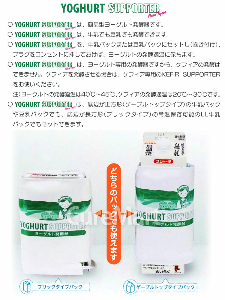 ※※ご注意ください※※ヨーグルトサポーターは設定温度が約50度(発酵温度40-45度)です。発酵温度20-30度のケフィア菌にはご使用できません。ヨーグルトサポーター は、牛乳の温度をヨーグルトの発酵適温に保ちます。牛乳パックと豆乳のブリックパック両方に巻けるマルチタイプです。●季節を問わずに発酵適温にヨーグルトの発酵温度は40℃-45℃のため、夏場でも室温での発酵は難しい温度です。牛乳パックや豆乳パックにセットすれば、ヨーグルトの発酵適温に保ち、12-15時間で発酵が完了し固まります。