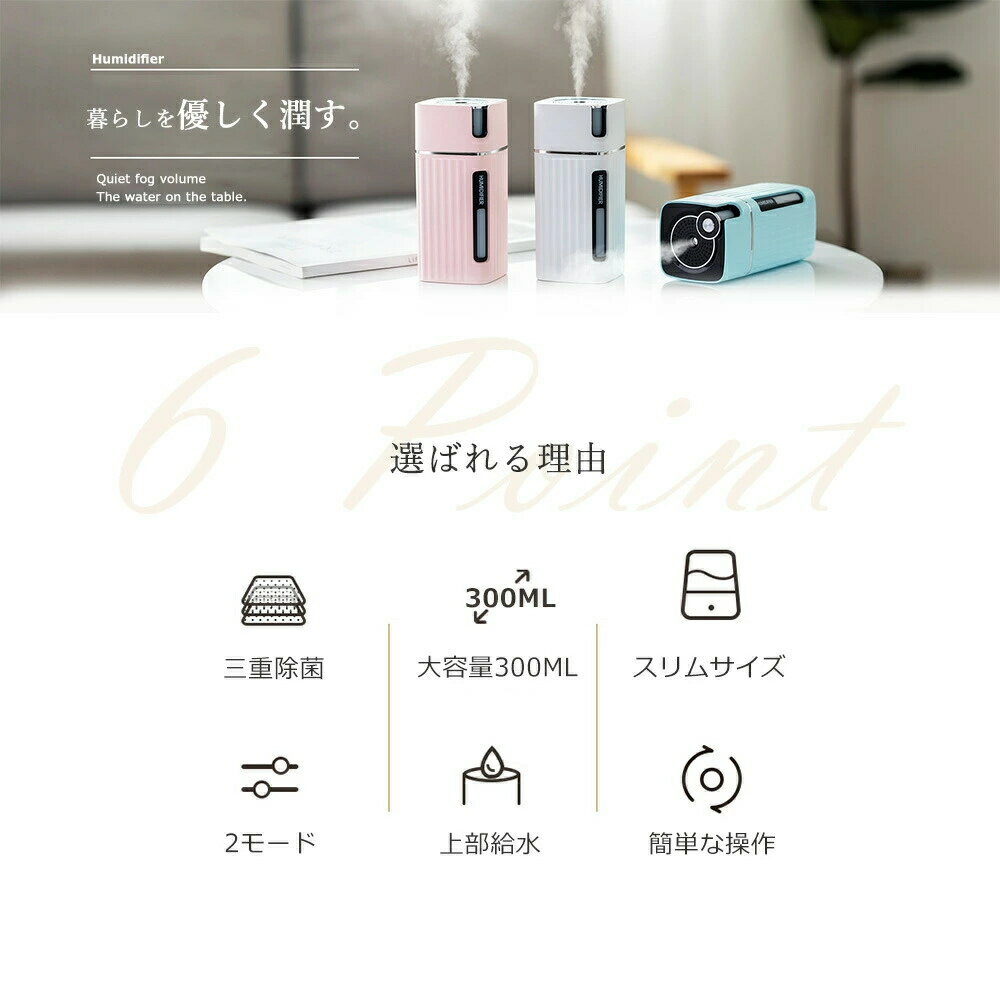 加湿器 卓上 卓上加湿器 300ML 大容量 お手入れ簡単 オフィス 小型 上部給水 上から給水 USB USB加湿器 充電式 車載 車 車用 静音 省エネ コードレス スチーム おしゃれ 寝室 リビング ベッドサイド 子供部屋 床置き 女子 女性 一人暮らし 可愛い 人気 ギフト プレゼント