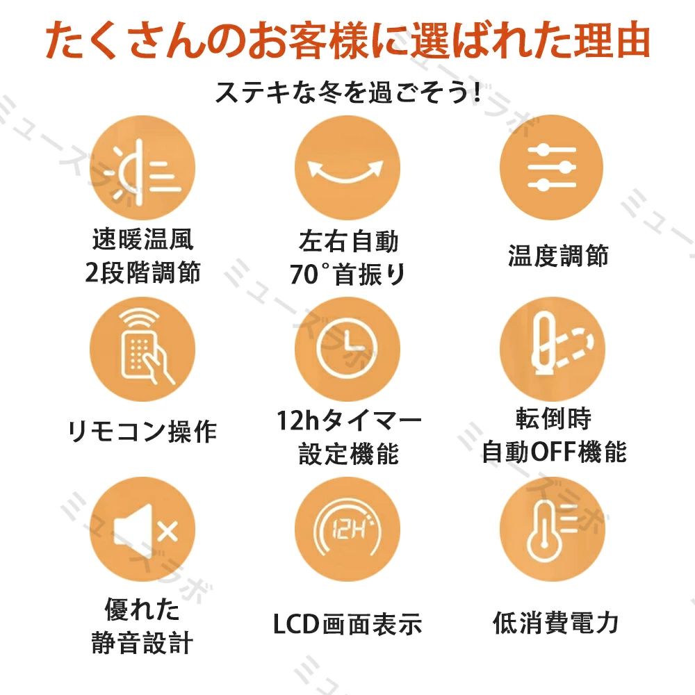 商品情報■2秒即速暖本電気ファンヒーターは電熱転換率の高いPTCセラミックを採用し、スイッチONですぐ熱が出ます。待ち時間なしで暖かな風が吹き出しますので朝の身支度や、帰宅直後など、すぐに暖まりたいというときにピッタリです。ガスやオイルなどの燃料を使用しないので燃費ゼロ!嫌な臭いがしませんので子供部屋でも使用できます。■節電できる知能恒温モード温度は15℃〜35℃まで1℃ごとに設定可能、また温度センサーを搭載して、周囲温度に合わせて運転を自動的に切り替え、人体に快適な温度をキープしながら細かい温度調節で省エネ運転に期待できます。温度センサーを搭載し、周囲の温度をリアルタイムに感知します。■70°左右首振り左右に最大70°自動首振りできて、より広い範囲を暖めるので、膝元や足元でも全身温める可能です。スタンド型スリムタイプで場所も取らず、脱衣室などの狭いスペースでも余裕で設置できてあちこちに簡単に移動して使えていいですばやく効率的に充満させ、タワー型セラミックファンヒーターで寒い季節に暖かさで包み込まれます!■12Hタイマー (1〜12H)12つのタイマーが設定可能。電源の消し忘れを防いだり、目覚める時間に合わせて動作させたりできる。■リモコン操作可能全ての本体操作が可能なフルリモコン式。ソファなどでゆっくりくつろいだまま遠隔操作できます。ディスプレイパネルでもリモコンで消灯可能、心地よい環境でより快適な睡眠が健康を守る!(*電池別途購入する必要があります。)■超静音運転葉が落ちるぐらいの30〜45dB運転音が睡眠、勉強、仕事に邪魔になりません。リビング、キッチン、脱衣所、トイレ、台所など場合の暖めにのスポット暖房にも最適で、勉強時に外気で冷えやすい時、寒い朝、立ち仕事時に役に立って、大活躍です。お年寄り、初心者、子供でもお勧めます。■転倒OFF・二重過熱保護使用中器具が外因で転倒や冲突する場合は、転倒保護機能が働きで電源を切り、火災などの災害を防ぎます。機内高温部分温度が80℃に超えるまたは機内低温部分50℃に超えると、PTCヒーター発熱自動的に停止して自然風モードに切り替えます。低温部分温度が40℃以下時、PTCヒーター運転が自動的に恢復します。また、機体は主に燃えにくいの材料を採用し、安全性はさらに上昇します。メーカー希望小売価格メーカー希望小売価格はメーカーサイトに基づいて掲載していますセラミックヒーター おしゃれ ECO恒温運転 電気ファンヒーター 電気ストーブ 転倒自動OFF 左右自動 70°首振り 12hタイマー付 15~35°温度調節 省エネ コンパクト 足元暖房脱衣所 トイレ オフィス セラミックファンヒーター ヒーター セラミック 暖房 セラミックヒーター 暖房器具 省エネ 電気 人気 セラミックファンヒーター 電気ファンヒーター エコ 電気ストーブ 節電ディスプレイ 首振り リモコン付き 速暖 5