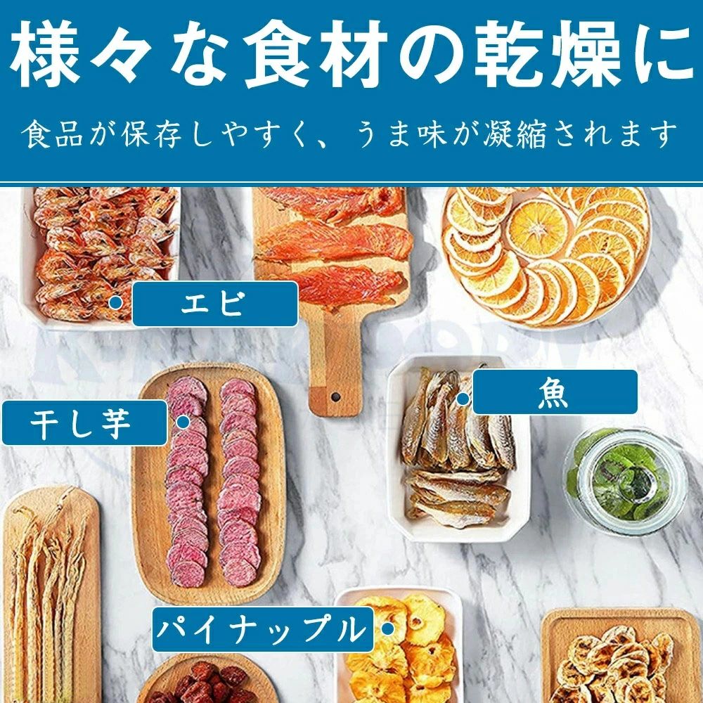 商品情報本体サイズ6層:約30×30.5×23cm8層:約30×30.5×28cm12層:約30×30.5×38cm18層:約30×30.5×53cm質量6層:約4.5kg8層:約5kg12層:約7.5kg18層:約9.5kg素材食品グレード304 ステンレス鋼新規上場食品乾燥機乾燥させることで果実・野菜・肉・魚などの栄養と旨味を凝縮し健康食・ダイエット食・保存食を簡単に作ることが出来る プロ用に負けない仕様で、自宅でドライフルーツ作りをお楽しみ頂けます。 屋外愛好家から健康志向への皆のための完璧な、この脱水はあっても乾燥し、効率的に設計さ【6/8/12/18段で一気に乾燥】トレーが6/8/12/18段あり、たくさんの食品を一気に乾燥させられる食品乾燥機。しかも、すべてのトレイの温度が均一になるように設計されています。コンパクトで場所を取らず、必要に応じて高さを変えられる汎用性が魅力の一品!食品に含まれる水分を飛ばして乾燥させる従来の方法と異なり、栄養価を保ったまま、乾燥させることが可能に!トレイの段数を自分のニーズにして減らしての使用も可能です。【簡単操作と低騒音】機械回転ボタンで温度・作業時間簡単に設定できます。温度調節30-90℃調節できます。タイマー12時間設定できます。手軽に乾燥野菜やドライフルーツを作れます。家族の健康だけでなく、愛犬の健康まで守れる嬉しい商品です。音仕様のモーターを採用し、作動音は約45-50dB、夜間運転でも静かです。【安心安全なステンレス鋼素材】この食品乾燥機は食品グレード304ステンレス鋼で作れられ、耐熱、錆止め、洗い易い。何時間加熱にしても劣化しないし有害物質も出ません、もっと安全安心。プラスチック製フルーツドライヤーに比べて、ステンレス製の方が洗浄しやすいだけでなく、寿命も長いです。【より均一な乾燥と360度熱風循環】弊社のフルーツドライヤーはプラスチック制フルーツドライヤーと異なり、ファンは底面ではなく背面に配置されているため、各層の食材はより均等に乾燥されます。背面ファン2個付き、360度循環の熱風で全トレイをしっかり加熱します。30-90℃の低温・高温乾燥に対応しています。干し野菜やドライフルーツ、ジャーキー、干し芋、ヨーグルト作りなど様々な食品の乾燥を行うことができます。【フルーツドライヤーが必要の理由】食品脱水機を使用して、味と食感を保持しながら、果物、野菜、キノコ、草薬、肉、魚などの様々な食物のミネラルとビタミンを簡単にロックすることができます。乾燥された食物は、より長い期間保存することができます。果物が食べきれない場合は、このフルーツドライヤーはあなたの最適な選択です。また、ペットにおいしいジャーキーを作るにも最適です。【管理栄養士推奨】食品から水分を蒸発させることで細菌・カビからの腐敗を防ぎ常温でも長期間の保存が可能になりさらに水分が飛ぶことでエネルギーやうまみが凝縮されます。フードドライヤーと天日干しを取り入れれば栄養価の増加が期待できるものもあり子どもやペットのための無添加な」おやつ作りにびったりです。ドライ(乾燥食品)を自分で作るとなると大変で中々作る機会はないと思いますがフードドライヤーがあれば簡単に誰でも作ることが出来るので栄養面やフードロスを気にする方には」最適な商品だと思います。関連キーワード食品乾燥機家庭用食品乾燥機業務用食品乾燥機日本製食品乾燥機家庭用業務用食品乾燥機家庭用食品乾燥機家庭用日本製食品乾燥機静岡製機食品乾燥機8層 フードドライヤー日本製 フードドライヤー業務用 フードドライヤー肉 フードドライヤー食品乾燥機 フードドライヤーenicyフードドライヤー魚 フードドライヤー ビーフジャーキー ドライベジタブル チップス 干し野菜 乾燥野菜 肉 小型 魚 ドライフードメーカー foodドライヤー フードドライヤー犬 ドライフルーツメーカー ジャーキーメーカーメーカー希望小売価格はメーカーサイトに基づいて掲載していますメーカー希望小売価格はメーカーサイトに基づいて掲載していますメーカー希望小売価格はメーカーサイトに基づいて掲載しています「楽天1位受賞」【5年保証】食品乾燥機 電気食品脱水機 ドライフルーツメーカードライフード 家庭用 業務用 ステンレス鋼 フードディハイドレーター 30〜90℃ 0〜12時間自由調節 360°熱風循環加熱 野菜乾燥機 干小魚 ペット用おやつ 干し肉 草薬などの製作 フードドライヤー 304 ステンレス鋼 30〜90℃ 業務用 野菜乾燥機 食品乾燥機 電気食品脱水 ステンレス鋼 タイマー付き 0〜12時間自由調節 6層・8層・12層・18層 電源 AC100-110V 50Hz/60Hz消費電力 650W動作音レベル 45db本体サイズ 6層:約30×30.5×23cm8層:約30×30.5×28cm12層:約30×30.5×38cm18層:約30×30.5×53cm保証年数 3年質量 6層:約4.5kg8層:約5kg12層:約7.5kg18層:約9.5kg電源コード長さ 約 150cm温度設定 30℃〜90℃タイマー 1時間ー12時間素材 食品グレード304 ステンレス鋼新規上場食品乾燥機 乾燥させることで果実・野菜・肉・魚などの栄養と旨味を凝縮し健康食・ダイエット食・保存食を簡単に作るこ