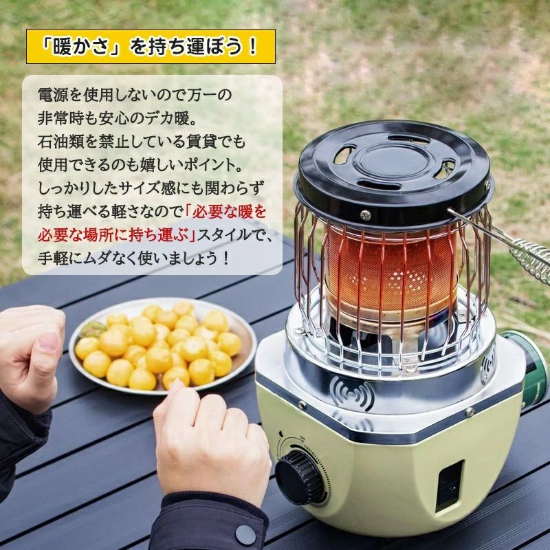 商品説明おすすめ★カセットガスストーブはこんな人におすすめ★◇キャンプに電源不要の暖房器具を取り入れたい人◇灯油よりも手軽な燃料の暖房器具に替えたい人◇災害時の備えとして暖房器具を用意したい人●燃料交換カンタン、手も汚れない燃料がカセットガスだから、入手も交換も手軽で面倒な燃料補給の手間なし!交?時にも手もよごさず操作も簡単。地震などの非常時にも役立ちます。●小型石油ストーブに匹敵する暖かさ少ないガス消費量で、とっても暖かい暖房効力。 優しい暖かさが得られるため、温風が苦手な方にもおすすめです。●軽量・コードレス。 持ち運び自在軽量なので手軽に持ち運びOK。部屋移動もラクに 行う事が出来ますね。またホースやコードがない ので、足元を気にせず安心して使用可能です。●足元からお部屋全体まで暖めます360℃に熱を放出するので、複数名で囲みながら暖を取るのに最適です。●天板でお湯が沸かせると便利天板で加湿程度の湯沸かし、調理済み料理の保温ができます。●収納袋が付属するかも重要なポイントクッション性のある収納袋がついたアイテムを選べば持ち運ぶ際の故障リスクを軽減できますよ。商品仕様【本体サイズ】:(約)31.5x19.5x18cm 【本体重量】:(約)2.2kg【発熱量】:約2.4kW(約1,980kcal/h相当)【生産国】:中国○使用上の注意事項○※改造/本来の目的以外/強い衝撃などはお控え下さい。※外装・タグ・説明書は外国語表記となりますので、あらかじめご了承ください。※ディスプレイ画面等の環境上、写真と実際の商品の色とは多少違う場合がございます。※海外輸入商品により、汚れ/ダメージ等がついている場合がございます。○以上、ご同意の上ご購入ください!○