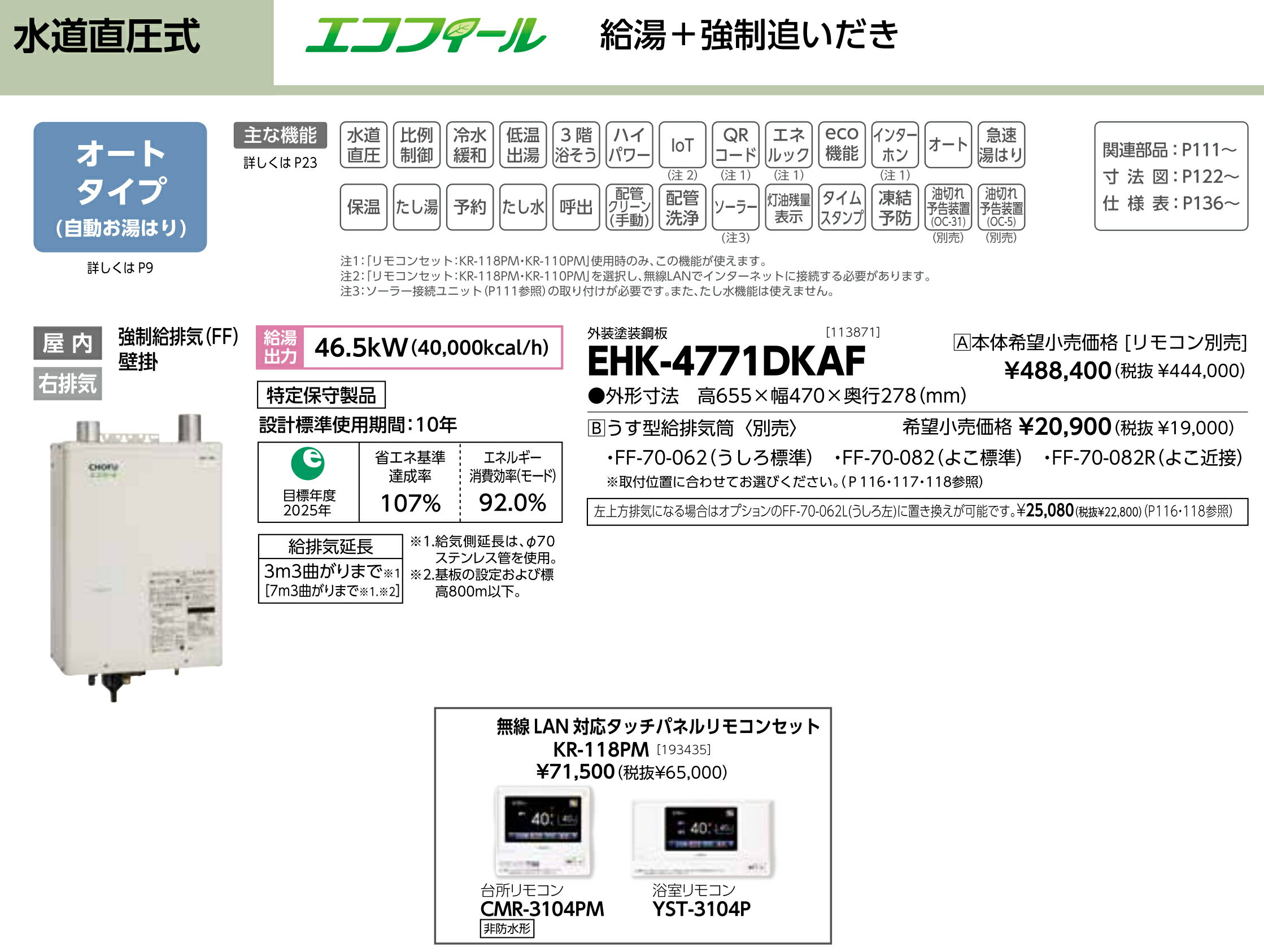 【2/10はエントリーで当店最大P5倍!】メーカー直送 代引不可 日時指定不可 離島不可 CHOFU 長府製作所 EHK-4771DKAF + KR-118PM 石油給湯器 無線LAN対応タッチパネルリモコンセット販売 所有者登録でメーカー3年保証