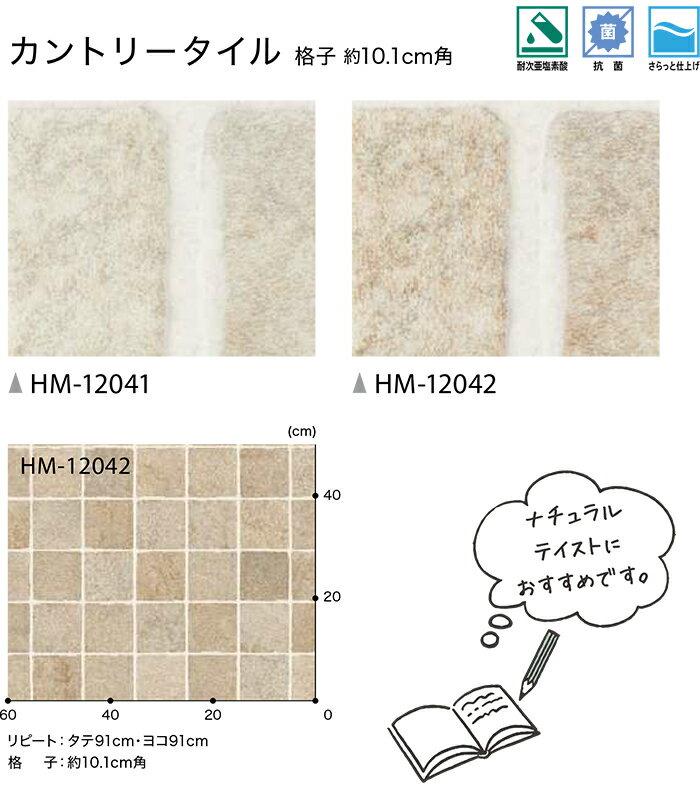 濃淡差のあるタイルがランダムに並んだタイル柄です。ナチュラルテイストにおすすめです。 ◆品番:HM-12041,HM-12042 ◆素材:塩化ビニール ◆厚み:約1.8mm ◆リピート:約タテ91cm×ヨコ91cm、格子:約10.1cm角 ◆長さ:最長20m ◆機能:耐次亜塩素酸、抗菌、さらっと仕上げ ◆その他:日本製 商品ページはこちら 色や質感をご確認いただくためのサンプルです。 実際の商品サイズとは異なりますので、ご了承下さいませ。サンゲツ クッションフロア カントリータイル 【生地サンプル】送料無料 お部屋のリフォームに最適な、一流メーカーサンゲツの切売りのフローリングカバーです。 汚れやすいキッチン・トイレ・お風呂脱衣所・子供部屋・ペットがいるお部屋にオススメです! 水に強いのでお掃除もカンタン♪ ハサミやカッターで簡単に切れるので施工も楽々!