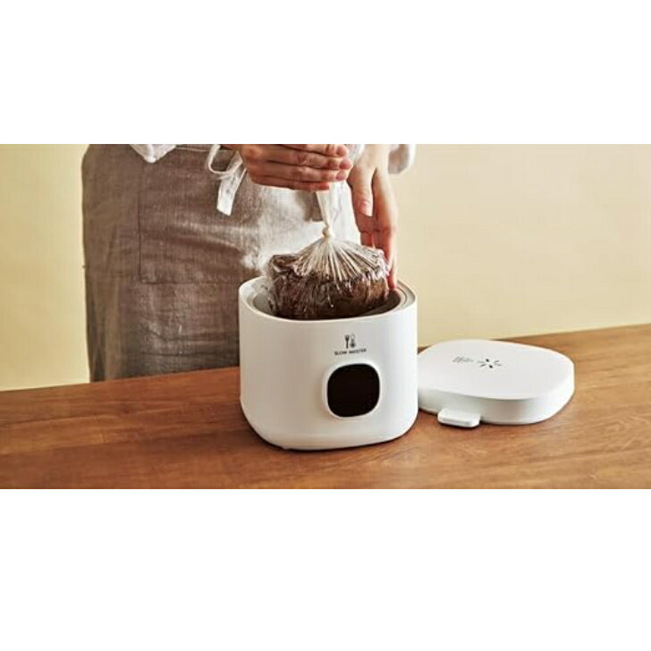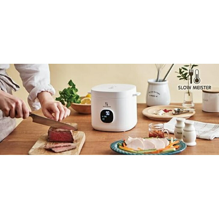 アピックス APIXスローマイスター ALC-750アピックスインターナショナル APIX INTL 低温調理器 低温調理機 スロークッカー スローマイスター 温度調節 タイマー機能 レシピブック付き 低温加熱 調理器具 SLOW MEISTER ほったらかしにできる低温調理器 タンパク質の凝固や肉汁の流出を抑え、食材の栄養や旨味を保持することもでき、しっとりやわらかな仕上がりになります。低温調理の定番「ローストビーフ」「サラダチキン」がプリセットで設定でき、初めて低温調理に挑戦する方や、身体づくりや筋力アップの為に頻繁に調理する方にも便利です。 また、本体自体が釜の形状なので、大きく深い鍋を別で用意しなくても直ぐに使えます。使い方も簡単!食材を耐熱性の食品用ポリ袋に入れて水を注ぎ、タッチパネルで設定をするだけ。 忙しい方にぴったりの究極のほったらかし調理家電です。大きな鍋を買う必要はありません。すぐに使える。プリセットメニュー or 調理温度/調理時間をタッチパネルで設定レシピブック付き 毎日の献立のヒントになる7品目のレシピ掲載プリセットメニュー搭載 誰でもかんたん低温調理最短2タッチの簡単操作でローストビーフ・サラダチキンなどの低温調理が出来る 省手間・省資源・省エネな低温調理器です。大きな鍋を用意する必要がなく、買ってすぐお使いいただけます。「毎日使える」を目指した 7DAYS RECIPE BOOK 付き>プリセット以外でも、温度は 1℃単位(40℃〜95℃)、時間は 5 分単位(1分〜300 分)と 細かく設定できる仕様なので、様々な食材を低温調理、ボイル、保温を行う事ができます。 また低温調理初心者でも、簡単に実践できるレシピブックが付属。「サーモンのコンフィ」や「リンゴの甘酒コンポート」など、食事メニューからスイーツまで7種の料理をすぐにお楽しみいただけます。 2