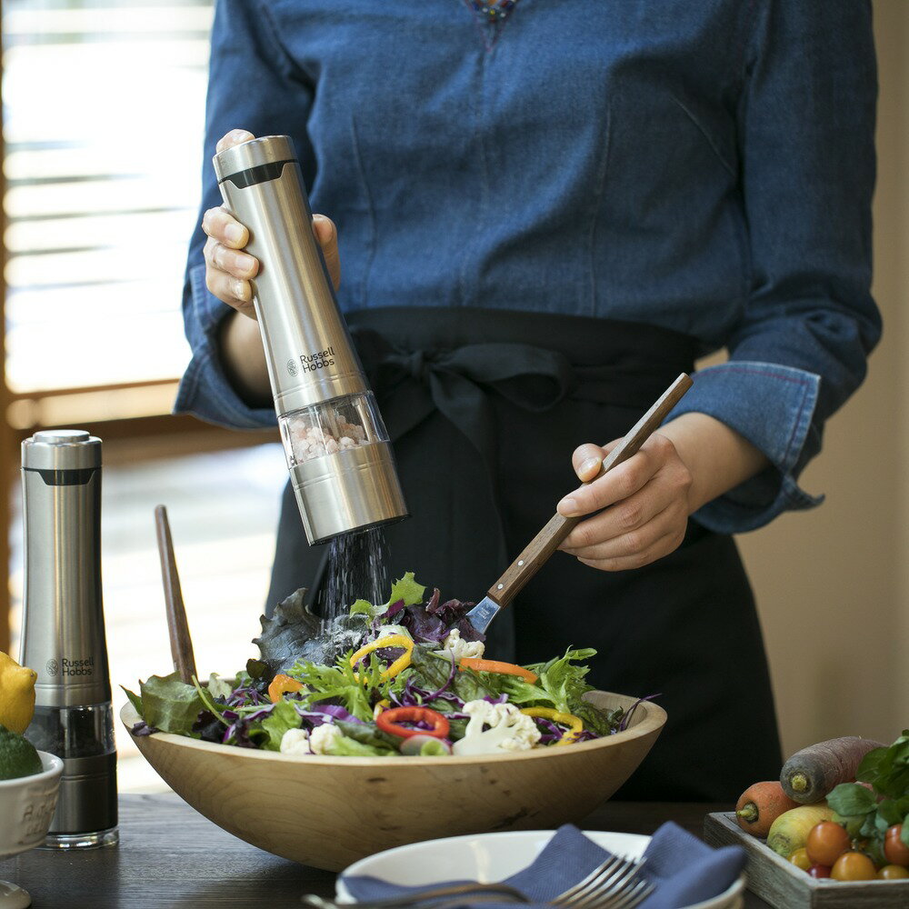 押すだけワンタッチ。料理中も片手でOKミル上部のボタンを押すと、電動で挽くことができます。片手で操作できるサイズ感で、食材を混ぜたり炒めたりする手を休めずに使用することができます。ミルの転倒を防ぐ専用木製スタンド木製スタンドにミルを立てることによって、ミルの転倒を防ぎます。 また、ミルは引いた後に、どうしても挽いた粉がわずかにこぼれるので、受け皿の役割にもなります。ステンレスとウッドの組み合わせは、一層高級感が増して見え、インテリア映えも間違いなし。ミルと木製スタンドのセット商品ならギフトにも最適です。残量が見やすい透明なキャビン残量が一目でわかるよう、キャビンは透明になっています。また、広めの充填口により、塩や胡椒を楽に上手に入れることができます。岩塩にも使えるセラミック刃錆の心配がなく、岩塩にも使用できる丈夫なセラミック製の刃を採用。また、摩擦熱が生じにくいため、熱で飛びやすい胡椒の香りを保ちます。※ピンクペッパーなどの水分や油分を含む食材(スパイス)には使用できません。好みの挽き方が可能キャビン下のステンレス部分を「+」や「−」の方に回すと、粗いものから細かいものまで、お料理やお好みに合わせた挽き方を自在に調節することができます。樹脂製の専用スタンド付きグラインダー部に残る細かな胡椒や塩がテーブルなどに散って汚れないように、樹脂製の専用スタンドが付いています。汚れたらサッと洗えるのでお手入れも簡単です。LEDで手元を明るく点灯上部のボタンを押している間はLEDライトが点灯します。手元を明るく照らしてくれるので、暗い場所でも挽いた分量の確認がしやすく便利です。関連商品のご案内こちらの商品は木製スタンドが付いた2本セットですが、スパイスごとの買い足しに便利な1本タイプと、木製スタンドなしの2本セットもラインアップしています。さらに、より握りやすい小型タイプの木製スタンド付き2本セットもご用意しています。下部のおすすめ関連商品からご確認ください。■Russell Hobbs(ラッセルホブス)について1952年イギリスのマンチェスターにて創立。実用性だけでなく、遊び心あるデザインを探求し世界中に家庭用電気製品を届けています。ラッセルホブスのブランド名は創業者であるビル・ラッセルとピーター・ホブスの名前から名付けられました。ページ下部に画像の説明がございます。一部別売りの商品もございますので、説明文ご確認のうえご注文ください。>画像の説明はこちら<仕様・サイズ■セット内容:電動ミル2本+専用木製スタンド■サイズ:径6cm高さ23cm■重量:330g■素材:ステンレス・セラミック・ABS樹脂・AS樹脂■電源1.5v■単3乾電池4本使用(別売)■中国製■家電製品は、ご使用前に必ず取扱い説明書をよくお読みください。なお、通電後のお客様理由による交換・返品はお受けできませんので、ご了承ください。※こちらは木製スタンドが付いた2本セットとなります。ご確認の上ご購入下さい。【送料マーク:A】 この商品の販売価格には配送料880円(税込)が含まれています。 画像の説明本体2本をセットできる専用木製スタンドをお付けしてお届けします!電動式だから、料理中も手を休めることなく、さっと片手で塩・胡椒などの味付けが完了。残量が一目でわかるよう、キャビンは透明になっています。片手でプッシュ出来るので、料理中も、仕上げにも大活躍!摩擦熱が生じにくいため、熱で飛びやすい胡椒の香りを保ちます。手元を照らすLEDライト付き。粗挽きも細挽きも塩や胡椒が散らばりにくい樹脂製の専用スタンド。錆の心配がなく、岩塩にも使用できる丈夫なセラミック製の刃を採用。色々な調味料に。片手で操作できるサイズ感で、食材を混ぜたり炒めたりする手を休めずに使用することができます。木製スタンドにミルを立てることによって、ミルの転倒を防ぎます。 実用性だけでなく、遊び心あるデザインを探求し世界中に家庭用電気製品を届けています。木製スタンド付の2本セット。