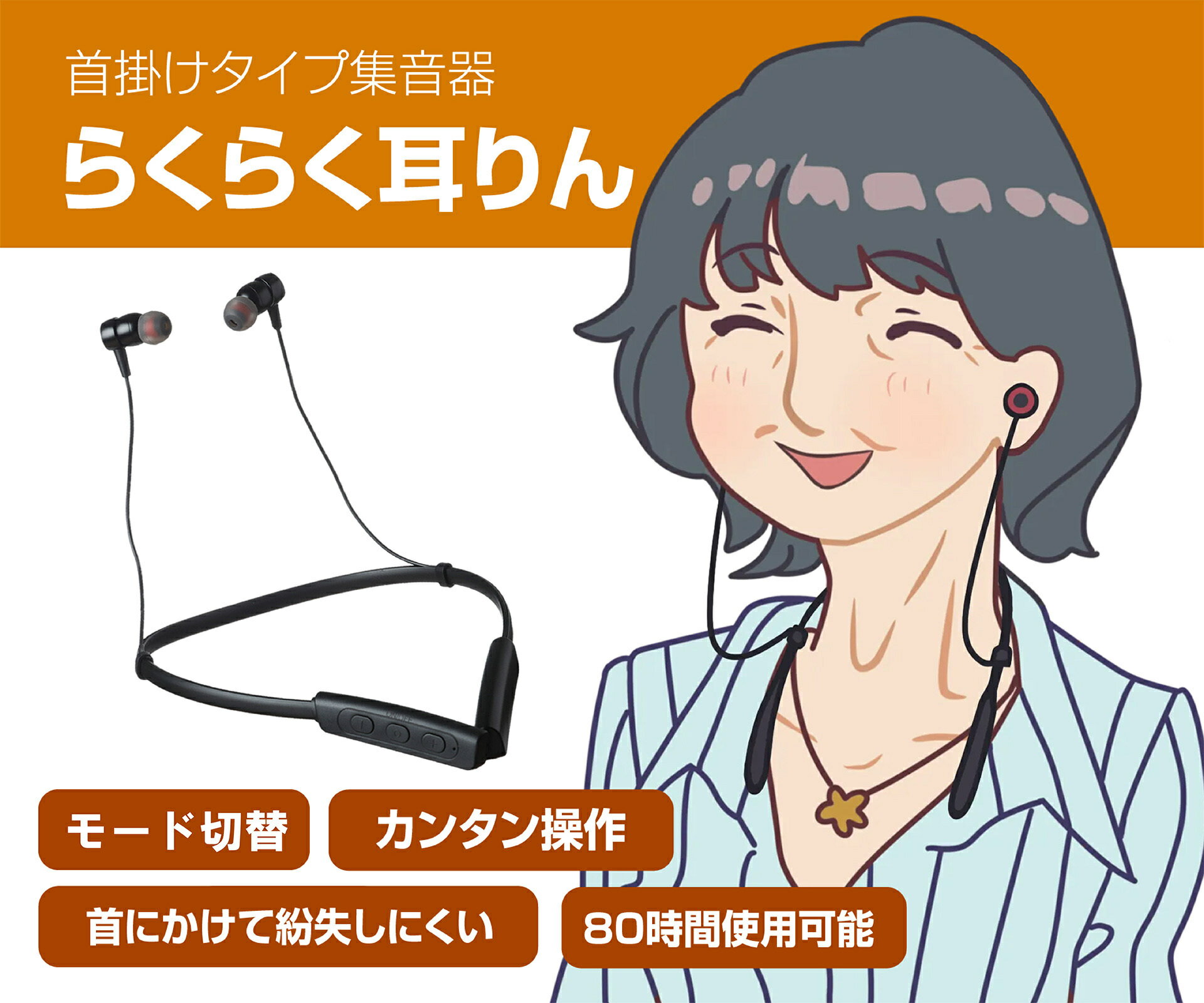 らくらく耳りん 首掛けタイプ集音器 DRM101B クリアな音声で日常がもっと楽しくなる らくらく耳りん集音器です。 首にかけて紛失しにくい 首掛けタイプ。 80時間使用可能です。 ●首かけタイプで疲労軽減 両耳付け、通常聴力に負荷がかかりづらい構造になっています。 通常のイヤホンタイプと比べて長時間の使用でも疲労感軽減。 ●シンプルで簡単操作! 大きなボタンの設計、音量とモード調整も簡単です。 ●雑音軽減機能付き 「+」ボタン、「-」ボタンを3秒長押しで 4つのモードに切り替え可能。 ●人の目をきにせずおしゃれに おしゃれの邪魔にならないスタイリッシュで実用的なフォルム。 メガネやマスクの装着に邪魔にもならず、 ストレスフリーでご利用いただけます。 **製品仕様** <品名> 首掛けタイプ集音器 <型番> DRM101B <サイズ> 本体 幅13×奥行185×高さ35mm イヤホンケーブル 約200mm <本体質量> 約28g <電池> Li-ion 3.7V 110mAh <ACアダプター> 入力:100-240V 50/60Hz 出力:DC5V、1.0A <USBケーブル> USB-A、USB Type-C、約300mm <材質> ABS樹脂等 <防塵防水規格> - ※本品は集音器です。医療機器の補聴器ではございません。 聴覚障がいの方向けではないため、該当される方のご使用はお控えください。