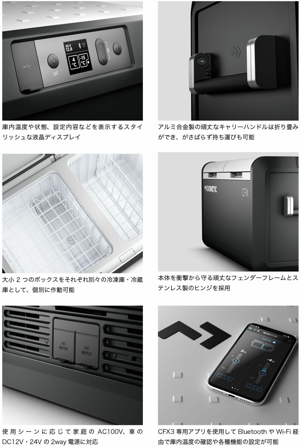 大小2つのボックスをそれぞれ別々の冷蔵庫・冷凍庫して、個別に作動するパワフルなクーリングボックス ●庫内の温度を1℃単位で設定が可能 ●最大-22℃まで庫内温度設定が可能 ●操作パネルや電源差し込み口は屋外でも使用可能な防水・防塵仕様 ●家庭のAC100V、車のDC12/24Vの2way電源に対応 ●車載バッテリーの電圧に応じて、自動的に電源をカットする安心機能付き ●取り出し可能なワイヤーバスケットが付属 ●電子機器の充電が可能なUSB差し込み口(5V/2A)を搭載 ●専用アプリ『CFX3』を使用して、遠隔操作が可能 ●定格内容積:75L / 45L(大ボックス)・30L(小ボックス ●定格消費電力:59W 安全に関するご注意 ●本製品は民生用です。通常の生活の用に供する目的で設計・製造されています。業務用途でのご使用はお控えください。アフターサービスの内容は業務用途対象外とさせていただきますのでご了承ください。また、製品修理以外の責はご容赦ください。●ご使用の際は、取扱説明書をよくお読みの上、正しくお使いください。●水気や湿気のあるところに、AC100V電源を用いて冷蔵庫を据え付ける時には、アース線を確実に取り付けてください。また、常時床面に水気がある場所に据え付ける場合は、専用の漏洩遮断機を設置してください。故障や漏電のときに感電する恐れがあります。アースの取り付けは販売店にご相談ください。●医学品や学術試料などは入れないでください。温度管理の厳しいものは保存できません。●食品を詰め込みすぎると冷却効果が悪くなりますので食品を詰め込みすぎないでください。●庫内側面に食品が触れると凍結する場合があります。●エーテル、ベンジン、アルコール、ライターなど揮発性、引火性のあるものは、貯蔵しないでください。爆発の危険性があります●戸外やガレージなど雨に濡れる場所へは設置しないでください。漏電による火災の恐れがあります。●AC100V、DC12V/24Vを同時に2つ以上使用しないでください。過熱により故障したり、火災の恐れがあります。必ず1つだけ使用してください。●メーカーや車種によりシガーソケットのサイズに違いがあり、DCプラグが合わない場合があります。付属のDCプラグがシガーソケットのサイズや規格に合わない場合は、ご使用にならないでください。また、市販の2連や3連などのシガーソケットを使用して、他の器具との併用はお止めください。過電流による発熱や接触抵抗の増大により、シガーソケットやDCプラグの溶けや発火の恐れがあります。●車内でご使用の際は、車のエンジンを停止してのご使用はお控えください。バッテリーが消耗してエンジンがかからなくなる恐れがあります。 ●外観・仕様は改良のため、予告なく変更することがあります。●実際の色と若干異なる場合があります。また、見る角度や照明により、色のイメージは微妙に異なります。●写真はイメージです。 こちらの製品は家電リサイクル対象の商品です。 家電リサイクル費用は\5,599です。(2022年8月現在) 又、弊社までお送り頂く送料+移送費が別途発生し、 家電リサイクル時は弊社指定住所までお送り頂く形となります。 詳細は、事前に下記までお問い合わせください。 (ドメティック TEL:03-5445-3333)CFX3 35 CFX3 75DZ