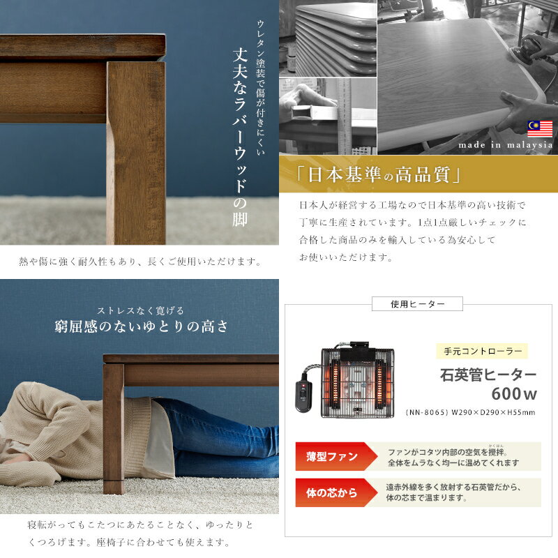 ご購入前に必ずにて商品の詳細をご確認下さい。また、商品に関して何かご不明な点は下記までお問い合せ下さい。萩原株式会社 スリーアイ本部086-523-4560※メーカーのサポート体制は予告無く変更・終了する場合がございます。※当商品は代金引換をご利用頂く事が出来ません。買い物かごのお支払方法にて代金引換をお選び頂かない様お願い申し上げます。 天然木のぬくもりを感じられるリビングこたつテーブル。5cmの継脚付きで座椅子に合わせて高さを変えられます。■家族が集まる暖かい空間へ 座って過ごせ、趣のある和モダンなテーブル ■継ぎ脚付きで高さを調整 継ぎ脚が1個ついているので天板の高さが微調整できます。 ■ストレスなく寛げる窮屈感のないゆとりの高さ 寝転がってもこたつにあたることなく、ゆったりとくつろげます。 座椅子に合わせても使えます。 ■熱や傷に強く耐久性もあり、長くご使用いただけます。 ◇サイズ (約)幅150×奥行85×高さ38(継脚時43)cm ◇素材 ・天板:ウォールナット突板 ・塗装:ウレタン樹脂塗装(UV加工) ・ヒーター:NN-8065 600W石英管ヒーター(手元コントローラー) ◇内寸及び補足説明 ・組立式 ・天板固定ネジ付 ・コード収納ボックス付 ・5cm継脚付