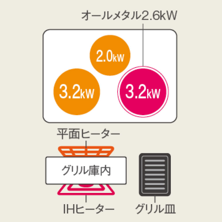 ご購入前に必ずメーカーホームページにて商品の詳細をご確認下さい。また、商品に関して何かご不明な点は下記までお問い合せ下さい。パナソニック商品専用ご相談窓口(フリーダイヤル)0120-878-365(フリーダイヤルに接続できない場合)06-6907-1187※メーカーのサポート体制は予告無く変更・終了する場合がございます。機能性とデザイン性を兼ね揃えたハイグレードモデル■3口IH シングル(右IH)オールメタル対応 ■IH&遠赤 Wフラット ラクッキングリル ■凍ったままIHグリル ■焼き物アシスト ■その他の特長 自動調理/オーブン調理/手動調理/鍋をグリルに入れて調理/光・揚げ物温度調節/光火力センサー/焼き物温度調節/自動湯沸し/自動炊飯/光るリング/オールメタル対応IH ◇定格電圧:単相200V(50-60Hz) ◇定格消費電力:5800W※4800Wに切り替え可 ◇外形寸法 ・本体:W598×D574×H230mm(ワークトップの上高さ11mm) ・グリル庫内有効寸法 (グリルで使える鍋の場合、底面から天井面までの高さ):W220×D360×H101mm (グリル皿の調理面から天井面までの高さ/書庫灯部を除く):)W260×D394×H91mm ◇製品質量:約26.5kg ◇保護機能 鍋なし自動OFF(IH)、空焼き自動OFF(IH)、小物自動OFF(IH)、切り忘れ自動OFF(IH・グリルヒーター)、温度過昇防止(IH)、グリル高温自動OFF(グリルヒーター) ◇コード:3芯EPゴムキャップタイヤケーブル、電源コード長さ約0.7m ◇適合コンセント:2極・接地極付 30A 250V