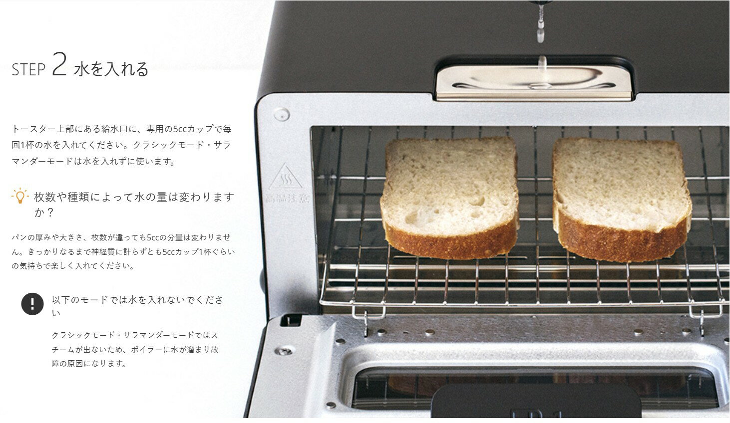 ご購入前に必ずにて商品の詳細をご確認下さい。また、商品に関して何かご不明な点は下記までお問い合せ下さい。バルミューダお客様ご相談窓口(フリーダイヤル)0120-686-717※メーカーのサポート体制は予告無く変更・終了する場合がございます。プロの火入れを実現するトースターの最上位モデル■感動のトースト『トーストモード』 ■究極のチーズトースト『チーズトーストモード』 ■焼きたての味わいを再現するリベイク『クロワッサンモード』『フランスパンモード』 ■あつあつのトースター調理『クラシックモード(170、200、230℃)』 ■さらなるおいしさを追求する方へ、『サラマンダーモード』 力を上火に一極集中させて食材の表面だけを焼きあげます。 短時間で強い焼き目がつけられるので、食材本来の食感や風味を活かした調理が可能です。 ◇本体寸法:357mm(幅)×324mm(奥行き)×209mm(高さ) ◇庫内寸法:275mm(幅)×224mm(奥行き)×178mm(高さ) ◇製品重量:約4.1kg ◇電源:AC100V 50Hz/60Hz ◇定格消費電力:1300W ◇電源コード長さ:約1m ◇運転モード 1.トーストモード/2.チーズトーストモード/3.フランスパンモード/4.クロワッサンモード/5.クラシックモード(170、200、230℃)/6.サラマンダーモード ◇タイマー:1~10・15分(サラマンダーモード:最大3分) ◇スチーム:5ccボイラー ◇パッケージ内容:5ccカップ、取扱説明書(保証書付き)、ガイドブック