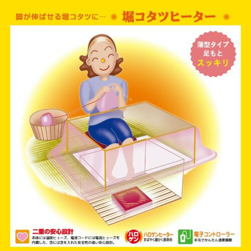 商品説明おすすめのポイント・足元スッキリ薄型タイプ。・速暖・速熱性に優れるハロゲン管ヒーター600W搭載。・手元でかんたん無段階温度調節!手元電子コントローラー付き。・二重の安心構造。本体に温度ヒューズ、コードに電流ヒューズ内蔵・公的試験機関による第三者認証(Sマーク)を取得しています。・足を伸ばしてのびのび。掘りこたつ用交換ヒーターです。□掘りごたつ専用設計スッキリ薄型タイプです。□立ち上がりが早い!速暖・速熱ハロゲンヒーター見た目にも暖かい明るいオレンジ色の光。□冬の楽しいこたつライフはコードの安全からこたつのプロがとことん考え抜いた、安心構造のこたつコードです。□操作しやすいダイヤル式無段階温調こたつに入ったまま手元で操作できて楽々。商品詳細□電源交流100V 50/60Hz□消費電力最大600W / 最小150W□ヒーターハロゲンヒーター□温度調節手元電子コントローラー無段階温度調節□温度制御感熱抵抗素子による位相制御□安全装置本体:温度ヒューズ電源コード:電流ヒューズ(電源コードプラグ内)□標準寸法幅31.4×奥行36(40.5)×高さ8.5cm※※奥行の( )内寸法は器具用プラグを取り付けた際の寸法です。□標準重量約2.0Kg□コード電子コントローラー(KE21D)丸打ちコードタイプ 3m