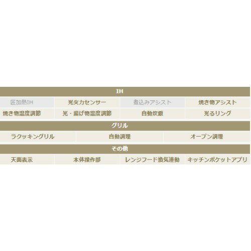 商品説明凍ったままIHグリルでさらに手間なくおいしく調理 こだわりのアルミ鍋や銅鍋を使って、おいしく調理できるオールメタルタイプ Aシリーズ □IH&遠赤 Wフラット ラクッキングリル 大火力で手早くおいしく、お手入れもラクラク 下からIH、上から遠赤のW包み焼きで、パリッとジューシーにおいしく仕上げます。 □凍ったままIHグリル 冷凍保存した食材を、解凍の手間なくおいしく焼き上げ。 凍ったままの食材を解凍せずにそのまま焼き上げ。 遠赤外線でムラなく焼き、調理後のおそうじも簡単。忙しい時でも手軽においしい料理が可能です。 □焼き物アシスト 温度・時間を自動設定、調理のタイミングもお知らせ。 表示10メニューから選んで設定し、調理が可能に。メニューを選択すると、温度・時間をIHが自動設定、裏返すタイミングなどを液晶表示と音声でお知らせ。 火力調節の難しい焼き物調理も手軽においしく焼き上げます。商品詳細タイプ 3口IH シングル(右IH)オールメタル対応 形状・色 トッププレート幅:60cm トッププレート色:シルバー 本体正面色:シルバー ヒーター ヒーター種類・最大火力/火力調整※1 左右IH:鉄・ステンレス対応 3.2kW/10段階 左右IH:アルミ(2.6kW/9段階) 後ろIH:鉄・ステンレス対応 2.0 kW/8段階 グリル:2.75kW 定格電圧・消費電力 単相200V(50Hz/60Hz) 5.8kW(4.8kWに切り換え可能)※2 本体寸法(約)幅×奥行き×高さ 598×574※3×230mm(ワークトップの上高さ11mm) 質量 26.5kg 庫内有効寸法(幅×奥行き×高さ) 220×360×101mm(グリルで使えるお鍋を使う場合、底面から天井面までの高さ) 260※4×394×91mm (グリル皿の調理面から天井面までの高さ) グリル皿寸法 258×394×40mm グリル皿重量 1200g コード・長さ 3芯EPゴムキャブタイヤケーブル 0.7m 電源プラグ 2極・接地極付 30A 250V 推奨コンセント 埋込型WF3630B(W) 露出型WK36301B(ブラック)/WK36301W(ホワイト) 付属品 100レシピ集 ※1 2つ以上のヒーターを同時に使用した場合、総消費電力量を超えないようにするため、IHヒーターの火力を自動的に制御します。(火力表示が変わらず火力を制御する場合と、設定火力が下がる場合があります。火力をあげるため[>]を押してもブザーが鳴り火力は上がりません。) ※2 工場出荷時は5.8kW設定 ※3 奥行寸法は、取っ手を含む全体寸法です。 ※4 庫内灯部を除く。同等品KZ-CA16MS