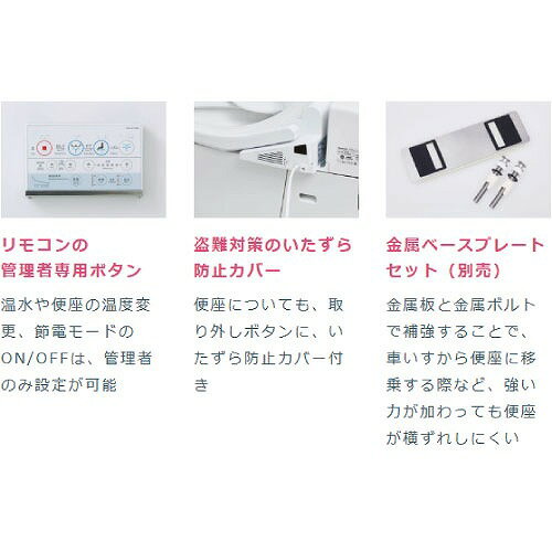 商品説明オストメイトの方を想う気持ちから生まれた、快適で使いやすい前広便座 誰もが毎日、安心して使いたいから。 やさしく快適なトイレを、すべての人へ。 病院や施設、駅やデパート、リラックスして過ごしたい自宅でも。 オストメイトの方をはじめ、トイレに時間がかかる方やそのご家族の誰もが安心して、いっしょに、心地よく使えるように。 便座の前方をゆったりと広くとった、美しいフォルムへ。 シーンもスペースも心配なく、思いやりをもってセットできるZA FREEは、今日を生きる、明日を生きるすべての人の、やさしく快適なトイレのために。 この便座は、わたしを、あなたを、自由にしてくれる。 □温水洗浄便座 機能紹介 ・温水洗浄機能 おしり洗浄とビデ洗浄ができます。 ・暖房便座機能 便座が保温されているため、寒い冬でも快適に使用できます。 □豊富な洗浄機能 ・ムーブ洗浄 ノズルを前後に移動し広範囲を洗浄 ・リズム洗浄 洗浄水の勢いに強弱をつけた洗浄 ・ノズル位置調整 洗浄水の当たる位置を調整 □ノズル材質 抗菌加工した「樹脂ノズル」は、ノズルに付着した菌の繁殖を抑制するため、衛生的です。 □ノズルオートクリーン 洗浄機能の使用前後でノズルをオート洗浄します。 衛生面に配慮した機能です。 □ノズルお掃除モード ノズルオートクリーンでも落としきれない頑固な汚れは、ユーザーが掃除する必要があります。 ノズルのお手入れをするための機能です。 □Bシリーズパブリックモデルの主な機能紹介 ・盗難防止機能 リモコンは壁面から取り外しができない仕様となっています。 ・管理者モード 不特定多数が使用されるため、使用者が安易に温度設定や節電設定を変更できないようにする管理者モードを搭載しています。商品詳細□使用用途 パブリック用 □区分 貯湯式 □機能 ・リモコン ・温水洗浄 ・暖房便座 ・脱臭 □付属品 補高便座 ・標準ベースプレート ・標準取付ボルト ・給水ホース(1m) ・分岐金具 ・リモコン取付金具 □最大消費電力 1070W(本体1010W/便座60W) □製品寸法 W440×D540×H140mm □製品重量 製品本体 約4.2kg □使用水圧範囲 0.069MPa(流動時)?0.753MPa(静止時)※1 □使用温度範囲 3?40℃ □電源コード 長さ1.2m □暖房便座 ・表面温度 切・約35℃/37℃/39℃ 3段階 ・安全装置 温度過昇防止器 □温水洗浄 ・最大洗浄流量 600mL/分 ・ノズル材質 樹脂 ・流量調整 5段階 ・機能 リズム洗浄・ムーブ洗浄 ・温水温度 切・約35℃/38℃/40℃ 3段階 ・安全装置 水位センサー・温度過昇防止器・温度ヒューズ ※1 使用水圧範囲以外では、十分な性能が得られない場合があります。